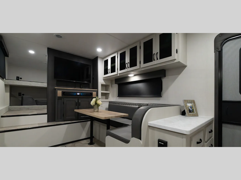 Sleeps 5 Slides 2 Length 28 ft 5 in Ext Width 8 ft Ext Height 11 ft 5 in Interior Color Linen, Carbon Hitch Weight 1144 lbs GVWR 8500 lbs Dry Weight 7365 lbs Cargo Capacity 1135 lbs Fresh Water Capacity 40 gals Grey Water Capacity 33 gals Black Water Capacity 33 gals Number Of Bunks 2 Available Beds Queen Refrigerator Type GE Dual Swing 12V Refrigerator Size 10 cu ft Shower Size 24" x 36" Number of Awnings 1 Water Heater Type On Demand AC BTU 13500 btu TV Info LR 40" 4K LED Smart TV Awning Info 20' Electric w/LED Light Strip and Pitch Adjustment Axle Count 2 Shower Type Tub/Shower Combo Electrical Service 50 amp Similar Floorplans