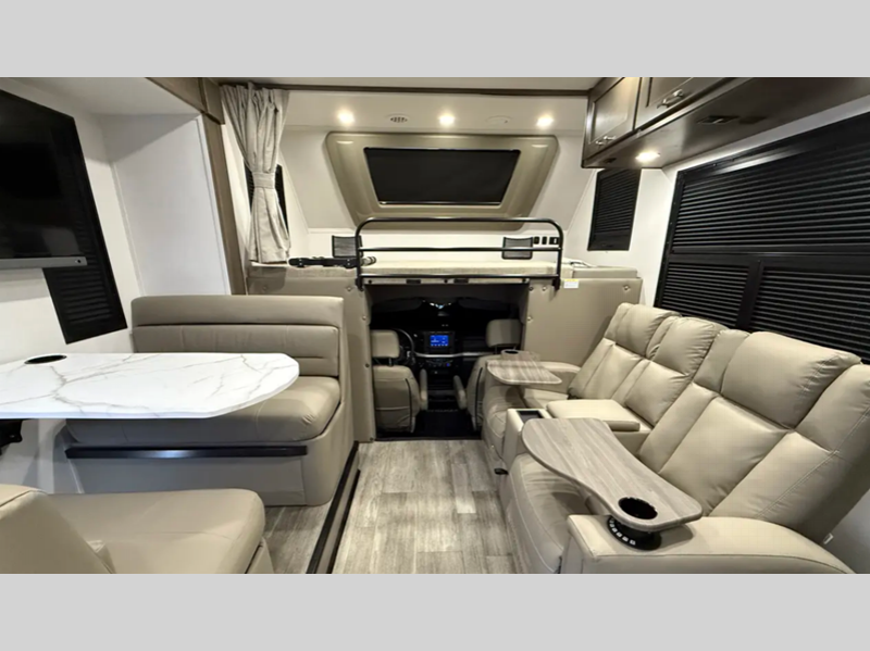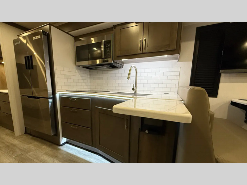 Advanced safety features include pre-collision assist (PCA) with automatic emergency braking (AEB) and an SOS post-crash alert system, providing unparalleled peace of mind. You can also stay effortlessly connected with the intuitive 8" touch screen Dash Radio with SYNC 4, featuring seamless wireless phone connection. The exterior showcases rugged 2" Aluminum-framed, laminated sidewalls with high-density block foam insulation, ensuring durability and optimal energy efficiency. Further, the interior design exudes refinement and warmth, with stunning hardwood shaker-style cabinetry and soft LED recessed ceiling lights.