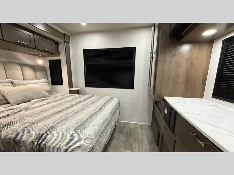 Sleeps 5 Slides 2 Length 34 ft 1 in Ext Width 8 ft 5 in Ext Height 12 ft 6 in Int Height 7 ft Interior Color Milano ll, Saddle, Desert (Dealer Stock Only) Exterior Color Custom Full Body Paint Package, Optional Single Color Full-Body Paint, Opt. Xplorer Package (Light, Dark or Midnight) Hitch Weight 15000 lbs GVWR 22000 lbs Fresh Water Capacity 78 gals Grey Water Capacity 45 gals Black Water Capacity 45 gals Furnace BTU 40000 btu Generator 8kW Onan Diesel Fuel Type Diesel Chassis Ford F600 XLT Horsepower 330 hp Fuel Capacity 66.5 gals Wheelbase 244 in Number Of Bunks 1 Available Beds Queen Torque 950 ft-lb Refrigerator Type 12V Refrigerator Size 15 cu ft Convection Cooking Yes Shower Size 30" x 36" Number of Awnings 1 Axle Weight Front 7250 lbs Axle Weight Rear 15500 lbs LP Tank Capacity 20.3 Water Heater Type On Demand AC BTU 30000 btu TV Info LR 40” Smart TV, BR 32" LED Smart TV Awning Info 16' Armless Patio with LED Lighting Gross Combined Weight 43500 lbs Shower Type Standard Electrical Service 50 amp Solar Wattage 200 watts Similar Floorplans