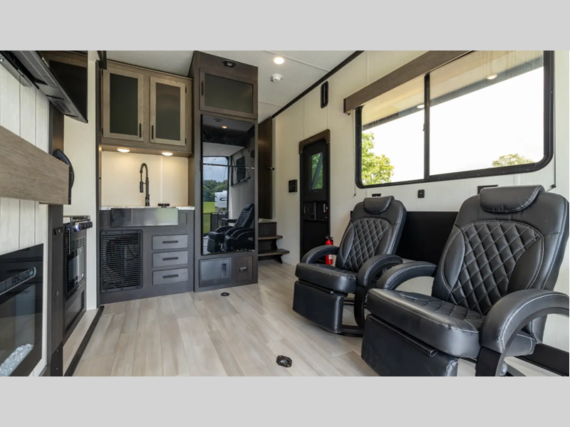 You will love the real wood cabinet doors and drawers inside, along with LED lights and a black stainless steel farm sink that will have you feeling more at home. There are power stabilizer jacks to make your RV more secure, and the power awning with LED accent lighting will create an outdoor space campground neighbors will want to check out.