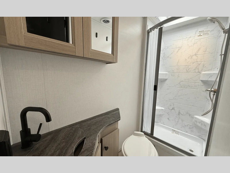 Each is built with aluminum framed laminated sidewalls and Superlite composite substrate that is water resistant, lighter than plywood, and better insulated. The interior offers power leather swivel driver and passenger seats in the cab area, soft touch self-closing drawer guides in the kitchen, a motion sensor light in the bathroom, and a 12V TV in the bedroom.