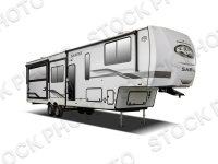 You will experience luxurious camping trips at an affordable price with any one of these Forest River Sabre fifth wheels! These models are durable and ready to travel anytime of the year thanks to features like the high-gloss gel-coat front cap with LED lighting, the PVC roof membrane, and the forced air underbelly with enclosed gate valves. The electric auto-leveling system makes setting up easy and safe, and the adjustable power awning with LED lighting will create an inviting outdoor living space. Each model includes a universal docking station which includes a black tank flush and an outside shower, and adjustable stable steps for you to enter and exit the unit safely. Inside, you will love the design of the ambient accent lighting in the living area, the real wood lumbercore cabinetry, and the linoleum flooring!