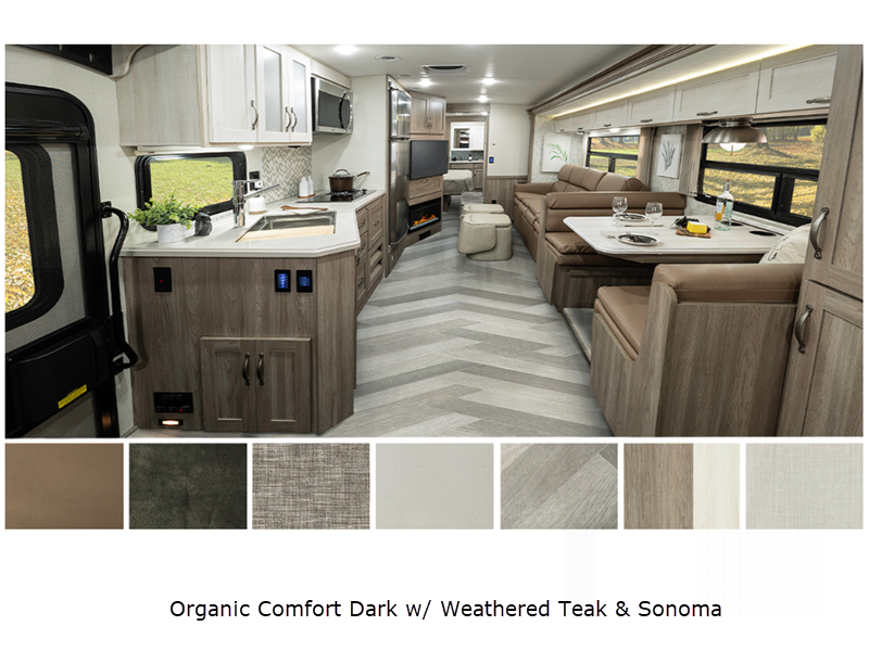 Sleeps 5 Slides 2 Length 35 ft 6 in Ext Width 8 ft 6 in Ext Height 12 ft 1 in Int Height 6 ft 10 in Interior Color Organic Comfort Dark, Organic Comfort Light, Bohemian Oasis Exterior Color Full-Body Paint; Silvermist, Wedgewood ll, Steel Grey, Night Sky Hitch Weight 5000 lbs GVWR 22000 lbs Fresh Water Capacity 75 gals Grey Water Capacity 57 gals Black Water Capacity 48 gals Tire Size 22.5" Furnace BTU 40000 btu Generator 5,500-Watt Cummins Onan Marquis Gold Fuel Type Gas Engine 7.3L V8 Chassis Ford F-53 Fuel Capacity 80 gals Wheelbase 228 in Available Beds King Refrigerator Type Stainless Steel Residential with Ice Maker and Water Dispenser Convection Cooking Yes Cooktop Burners 2 Shower Size 34" x 34" Number of Awnings 1 Axle Weight Front 8000 lbs Axle Weight Rear 15000 lbs LP Tank Capacity 76.14 lbs Water Heater Capacity 10 gal Water Heater Type 110V/LP AC BTU 28500 btu Basement Storage 122 cu. ft. TV Info LR 50" HDTV, BR 32" HDTV, Ext. 32" HDTV Awning Info 19' Power w/LED Lighting Washer/Dryer Available Yes Gross Combined Weight 26000 lbs Shower Type Radius Electrical Service 50 amp Similar Floorplans