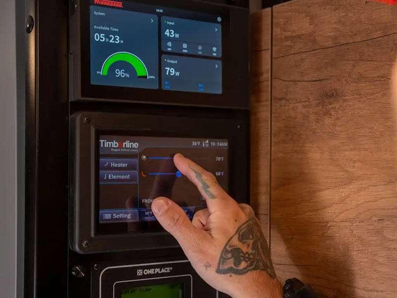 - Winnebago Power MAX (8.4kWh Lithionics® lithium-ion battery w/dual alternator charging capability, Bluetooth® control and pack heating system, EcoFlow® Power Hub Pro (5-in-1 power management controller [3,600-watt inverter, inverter charger, DC-DC converter, MPPT solar charger and alternator charger], touchscreen interface, and 210-watts of solar)