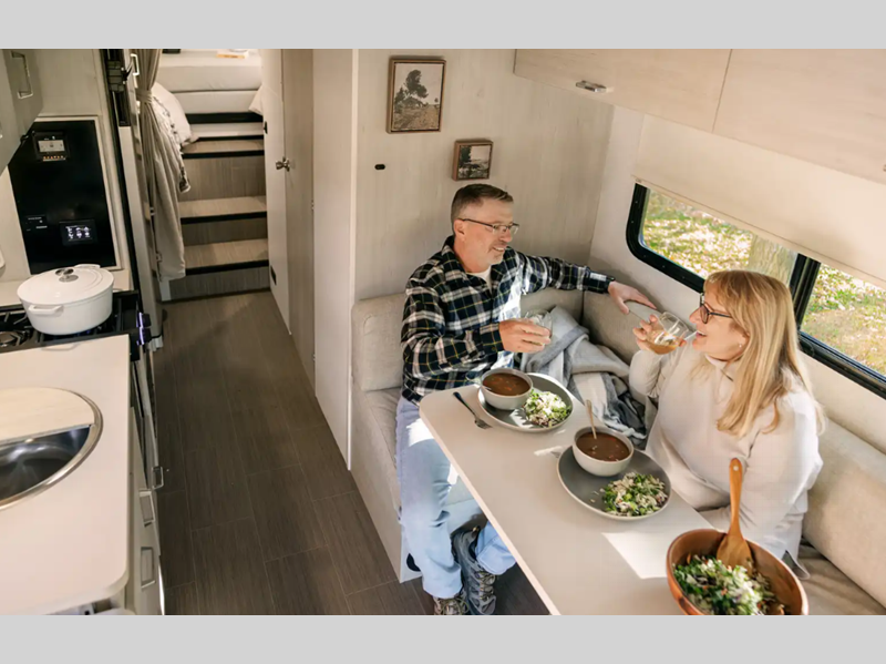- L-shaped dinette converts to sleeping area w/seat belts and