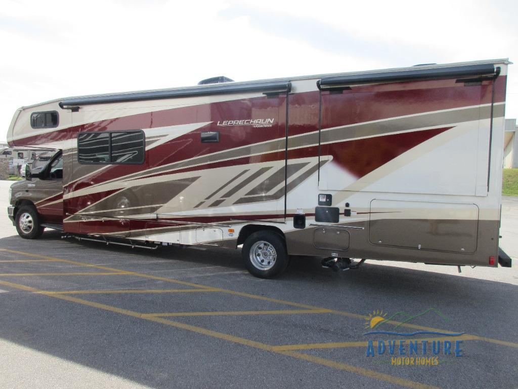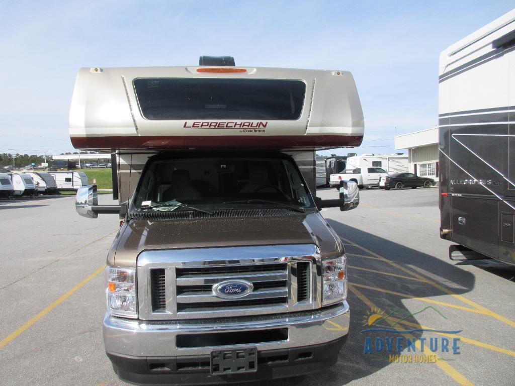 With each Leprechaun Class C gas motorhome by Coachmen you will enjoy "better" interior appointments, like the premium hardwood cabinet doors and drawer fronts, the one-piece thermofoil countertops, and the premium vinyl flooring. You will sleep soundly each night on the upgraded mattress, and staying clean will be easy with the premium showerhead and faucet in the bath. These models include reclining cockpit seats, cruise control, and a rear backup camera so you can easily get in and out of the campground. The Leprechaun is constructed with Azdel composite sidewalls, CrossFlex PVC, polyester reinforced roof material, and vacu-bond laminated walls, roof, and floor for a durable motorhome made to last.