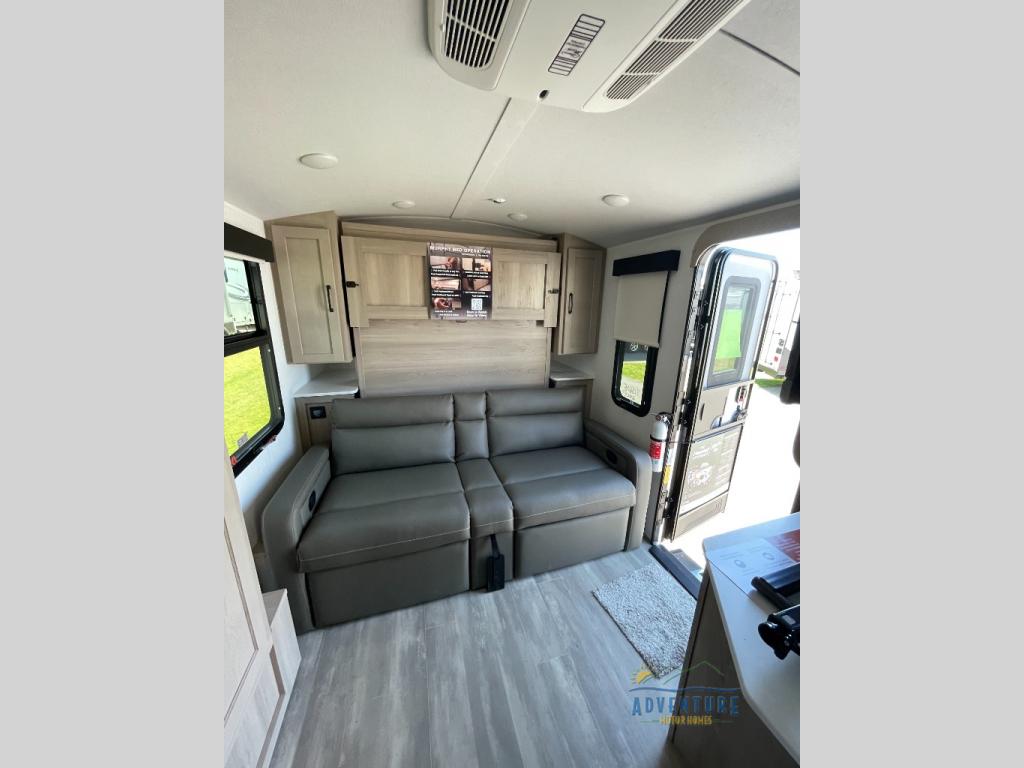 You will love the versatile living in this travel trailer! The jackknife sofa has a 30" x 15" table to relax and enjoy your meals prepared with the recessed three burner cooktop or heat up some leftovers in the convection microwave. At night you can transform the sofa into a 54" x 74" Murphy bed while you watch your favorite movie on the 32" TV across from it. You can freshen up each morning in the rear corner bathroom with the shower which has a shower miser water saver feature to efficiently use your water. The 11' power awning will protect you rain or shine as you cook at the outdoor griddle, and there is plenty of storage between the front outside storage area and the additional pass-through storage area!
