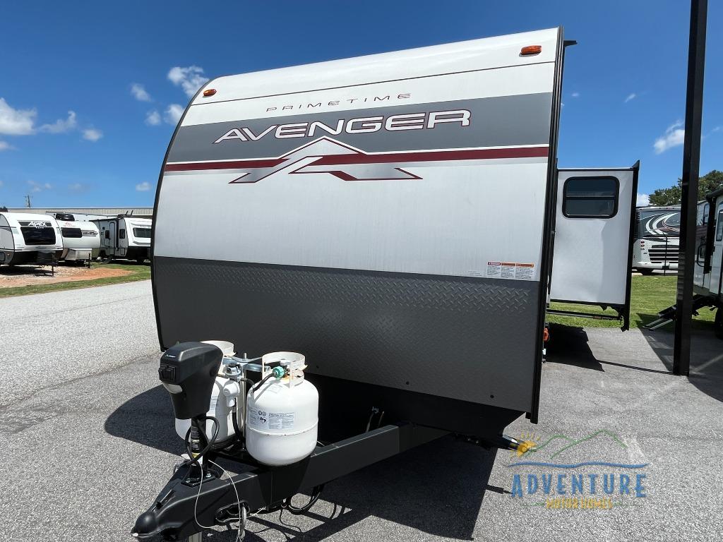 With any Avenger travel trailer by Prime Time, the exterior includes an aerodynamic smooth front metal, a diamond plate front rock guard for protection on the road, and four stabilizer jacks to keep your unit secure. There is a fully walkable roof plus an enclosed and heated underbelly that will help extend your camping season. The interior offers a 15,000 BTU air conditioner for the perfect climate inside, in-floor ducted heat, a systems monitor panel, and a Winegard 360+ antenna with Wi-Fi prep that will give you the option to stay connected as you camp. Each model also includes seamless Carefree Congoleum flooring, kitchen backsplash, shower pans in all models, and pleated nightshades throughout to name a few interior comforts!
