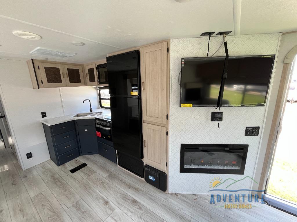 Why not have your own accommodations when you travel? Whether you want to explore outdoors or just have your own living space when away, this RV gives you convenience and comfort throughout. You will love having your own bedroom to retreat to each night with a queen-size bed, bedside wardrobes, and an additional closet for extra storage. You will also find that the main living area is a great place to relax with its two recliners, sofa, and booth dinette, and since these pieces of furniture are directly across from the entertainment center and fireplace, you will have an even more enjoyable time spending your evenings there. The pantry will hold onto your favorite snacks so that they are ready to go for movie night, and you can even prepare something more delicious by using the three-burner range to whip up some grilled cheese sandwiches.