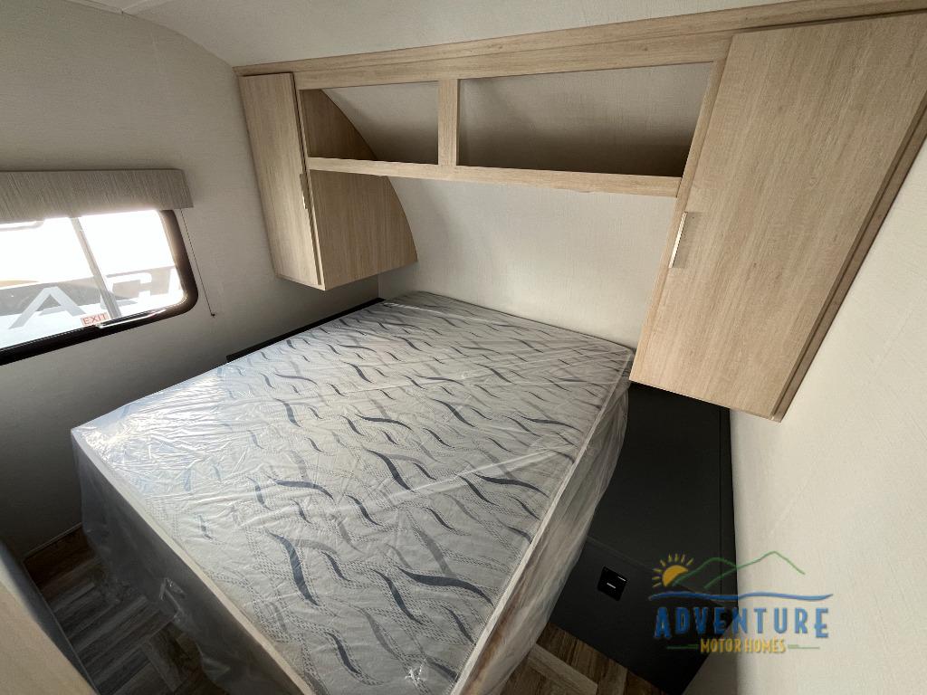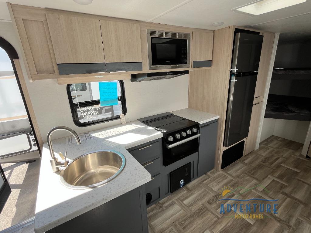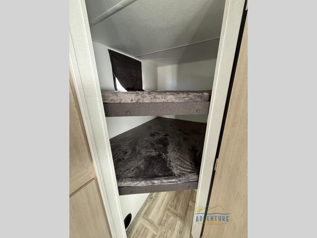 If you are looking for a trailer with double-size bunks and a private bedroom, you have found it! The queen bed and two wardrobes are behind a partial wall for added privacy. The double-size bunks are in the rear corner next to the full bathroom for convenience for the kids or your guests. And the L-shaped counter with a kitchen sink and full amenities sets up the cook nicely to be able to make meals for everyone. And you will love the extra floor space created by the booth dinette and sofa slide out.
