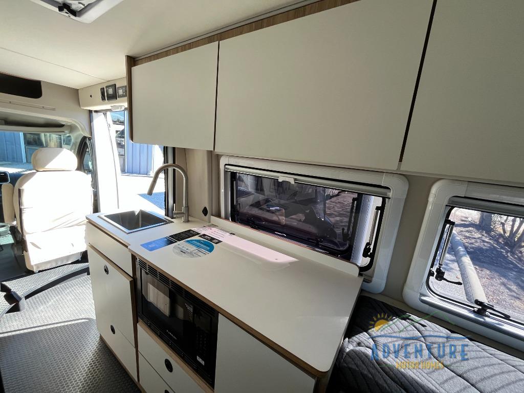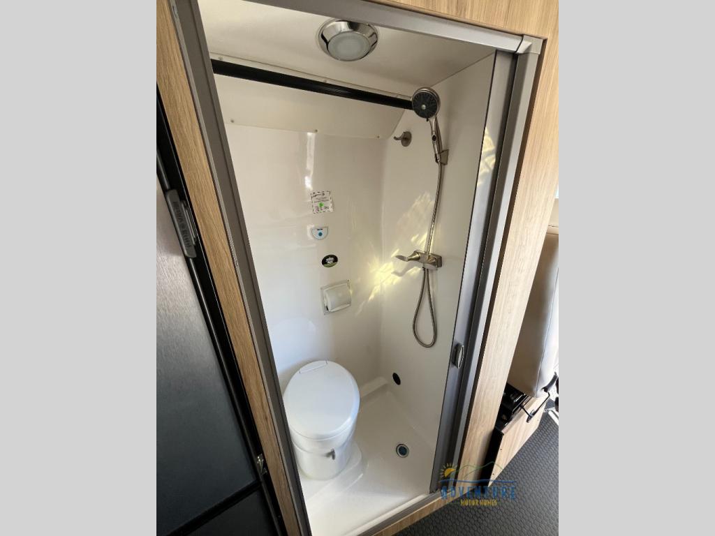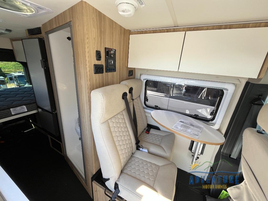 Start a new adventure across the states in this cozy coach! Once you arrive at the campground, you can make lunch on the induction cooktop or in the air fryer/convection microwave. There is also a 7.3 cu. ft. refrigerator with a pull-out freezer drawer to keep your food fresh. You'll find multiple overhead cabinets to keep your belongings tucked out of the way, and the compact wet bath will let you freshen up after a day outdoors. Up front, you'll find two captains seats plus two additional cab seats with a removable table and storage boxes. The 56" x 77" Murphy bed provides versatile sleeping space when you're ready to get some shut-eye. If you're needing additional sleeping space, you can choose the optional pop-top. When the optional pop-top is chosen, the standard Truma A/C is changed out for a Coleman Mach 10 A/C; see dealer for more details.