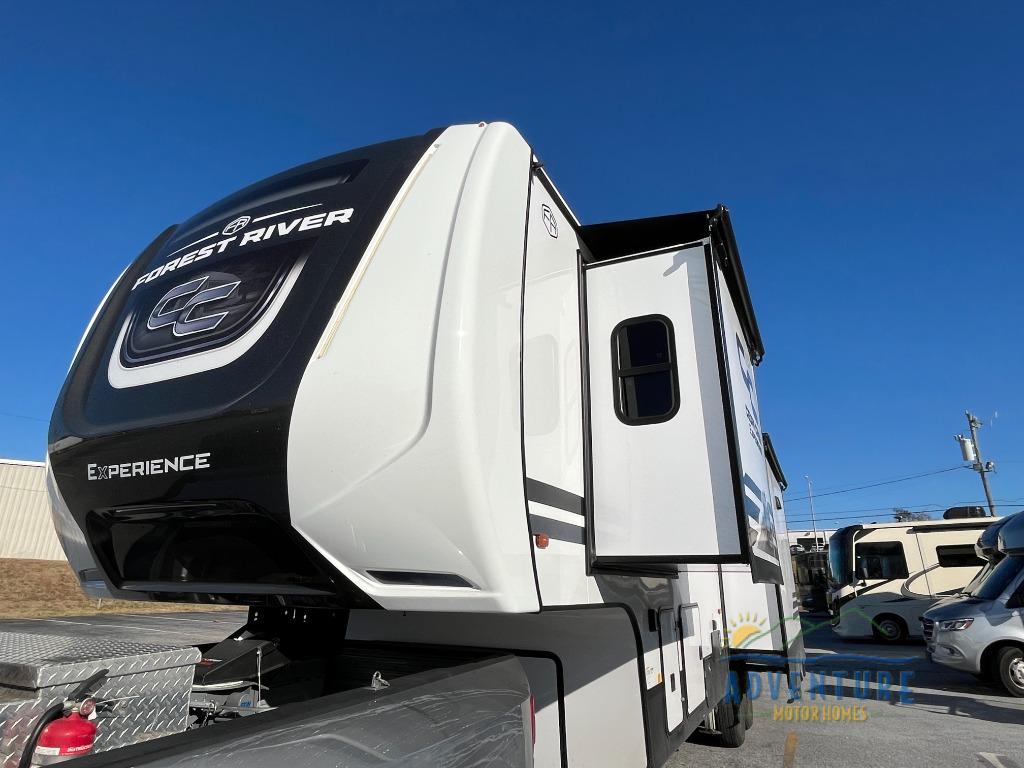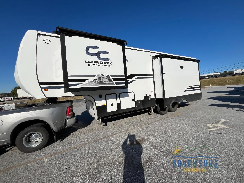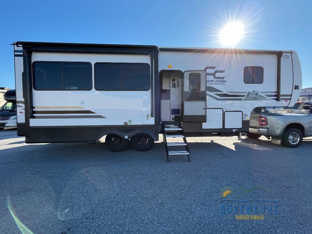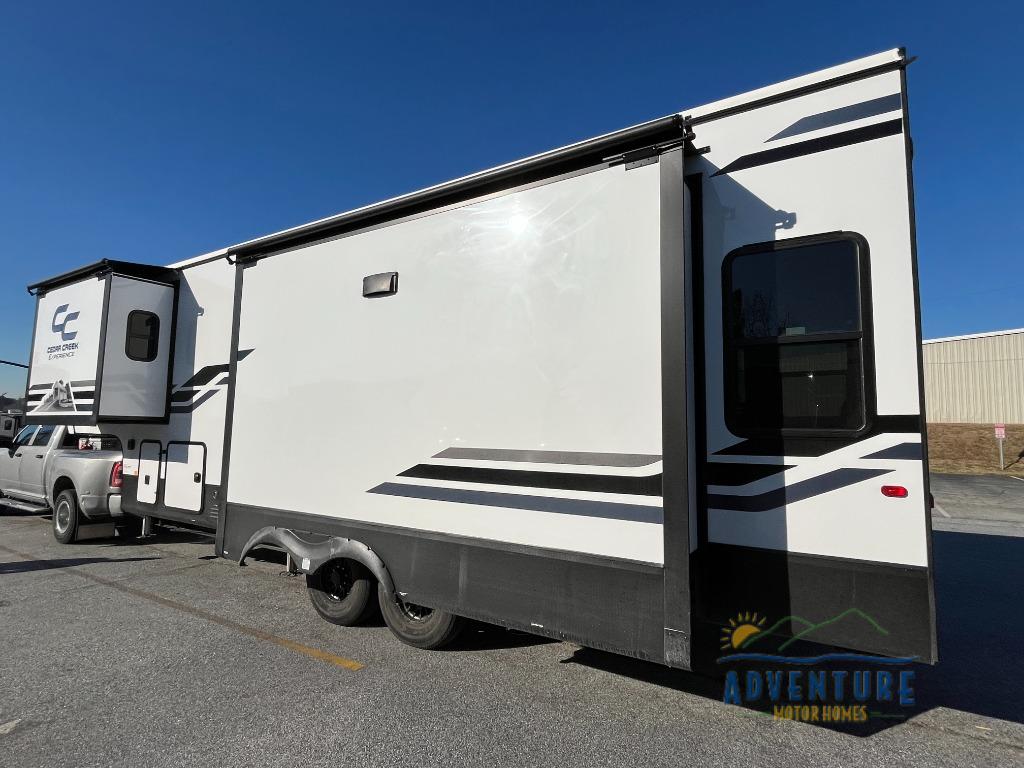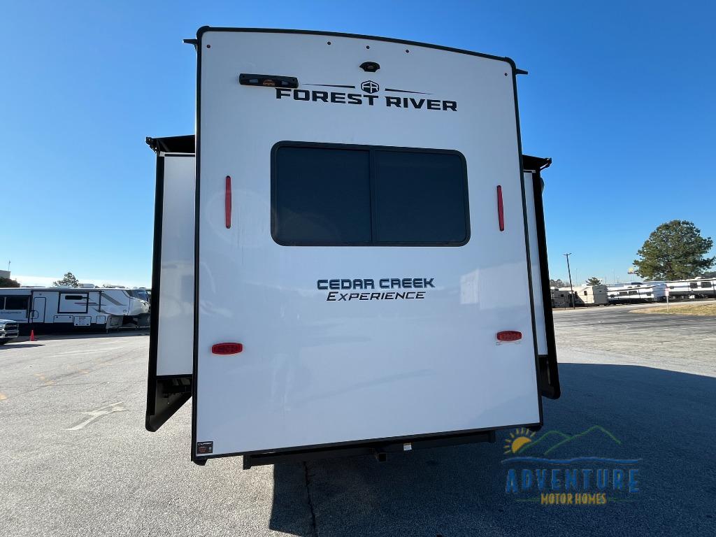 With any Cedar Creek Experience fifth wheel by Forest River, you will bet met with luxury features both inside and out! The True Gelcoat exterior is the best of the best in exteriors and the 3M bonded sidewalls will hold up over years of use. There is also a new 101'' wide-body frame, a Road Warrior suspension, plus a TST tire pressure monitoring system to make towing that much easier. You will find a hidden front storage compartment, along with a 4' x 6' ABS, ribbed, removable underbelly panels, and 6-point hydraulic leveling system, plus many more exterior conveniences. The interior will have you feeling like you haven't left home with vinyl floor coverings, power theater seating with USB ports, a cozy fireplace, vinyl floor covering and the list of comforts goes on! Each model is also pre-wired for satellite to the roof, and you're sure to never go bored with a Smart TV in the bedroom!