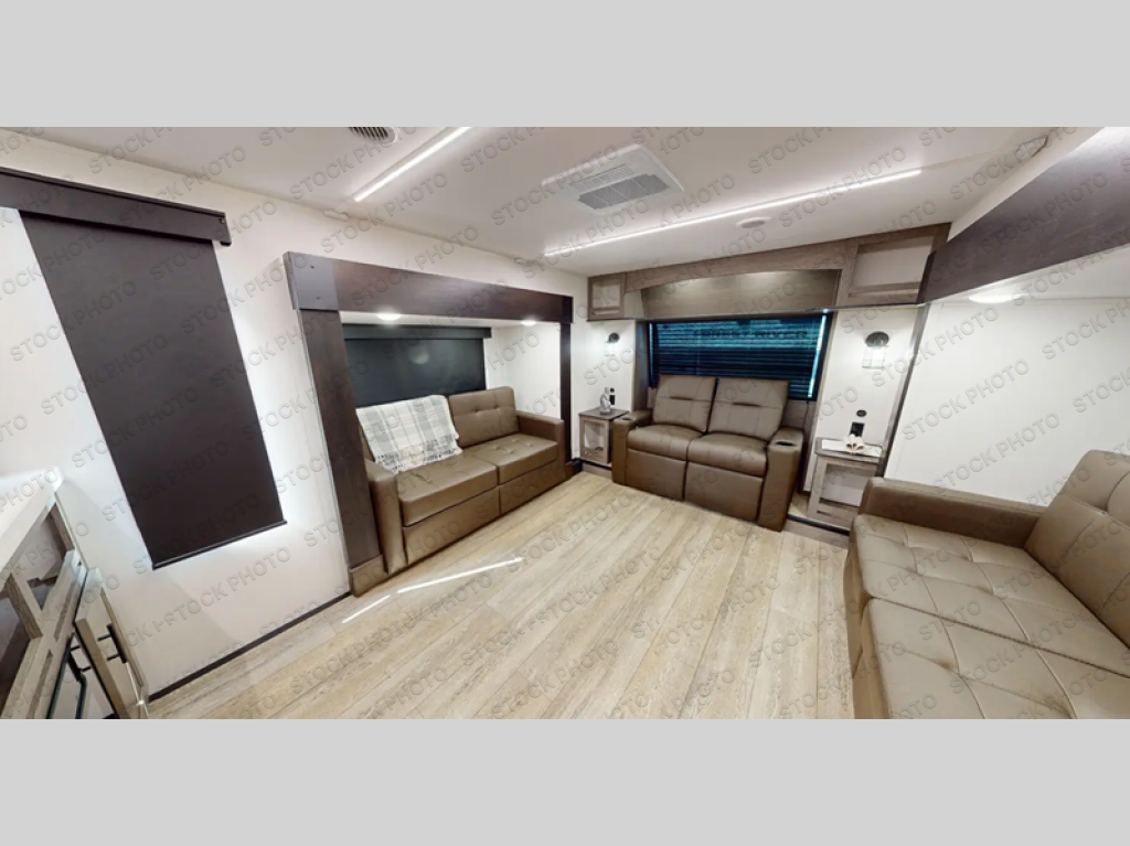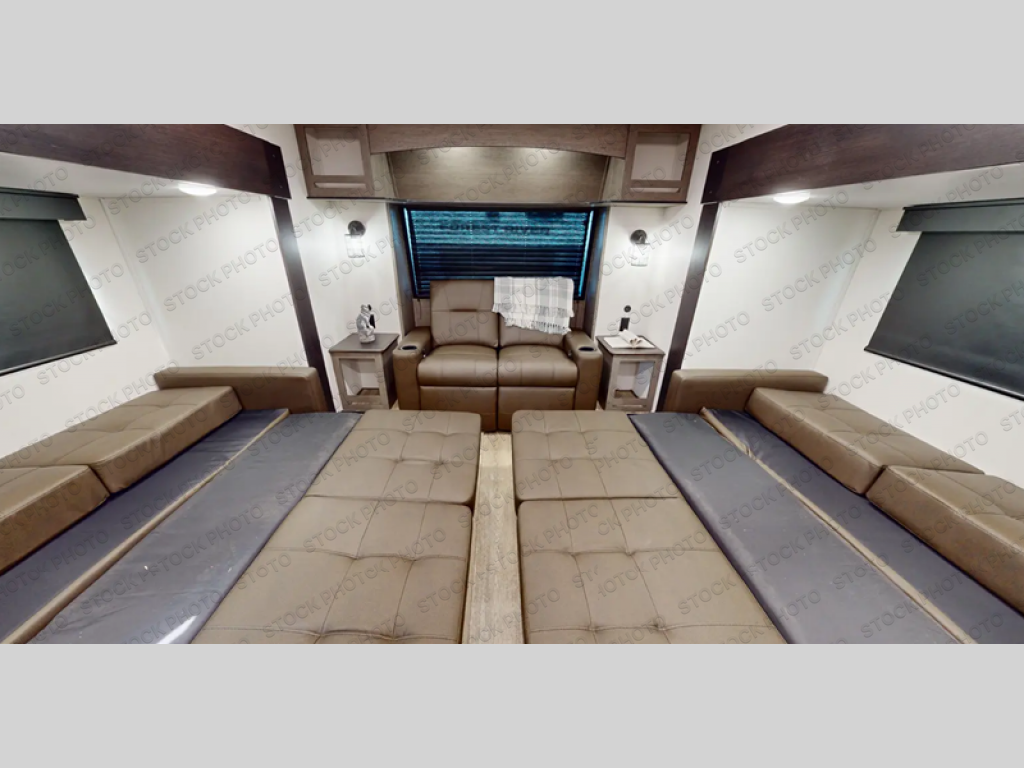 Five slides, a bath and a half, plus sleeping space for six make this fifth wheel the perfect choice! Once you arrive at your destination, prepare lunch on the exterior kitchen. Inside, you'll find a kitchen island, plenty of storage space, plus a free-standing table with chairs and a storage ottoman seat. The front living area will be a favorite place to hang out and this room can double as a bedroom with the two tri-fold sofas. There is also theater seating across from the entertainment center and fireplace, plus storage cabinets for movies or board games. When you're ready to call it a night, head to the master bedroom for a great night's rest on the king bed slide out. You will also love the full rear bath with dual sinks, a spacious shower, plus a closet with stackable washer and dryer prep!