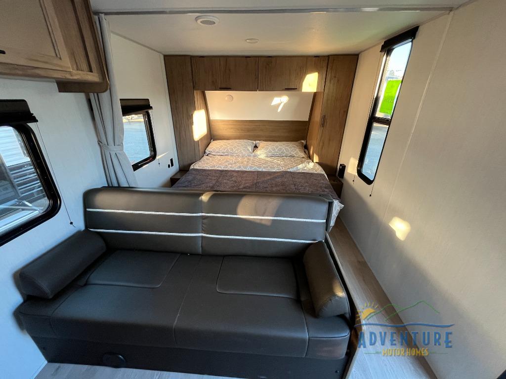If you like to camp with more friends and family, this travel trailer is for you! Since there are double-size bunks, a queen bed, plus a sofa and booth dinette, you can sleep eight people each night! The front bedroom includes the RV king bed, along with dual bedroom wardrobes and USB ports to charge your phones overnight. A full kitchen, complete with an air fryer and refrigerator will let the chef do their thing, and everyone can head outdoors to sit under the 15' patio awning!