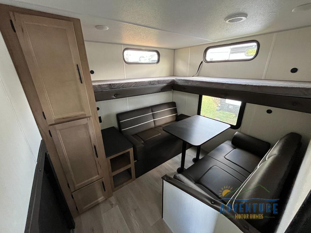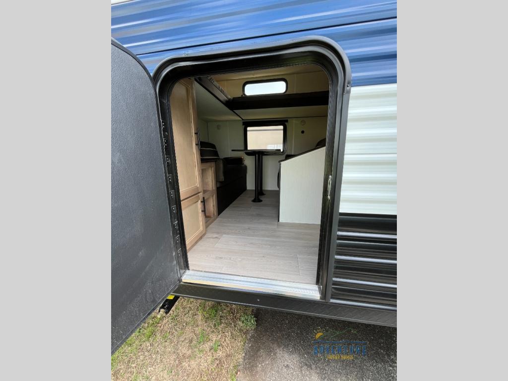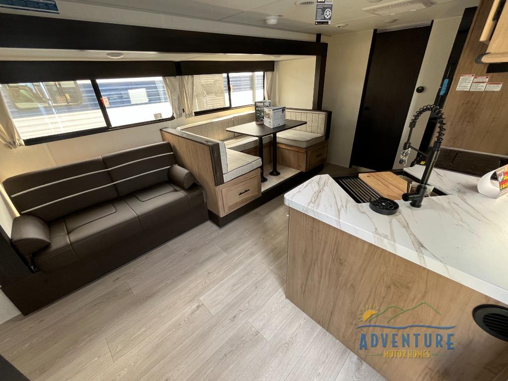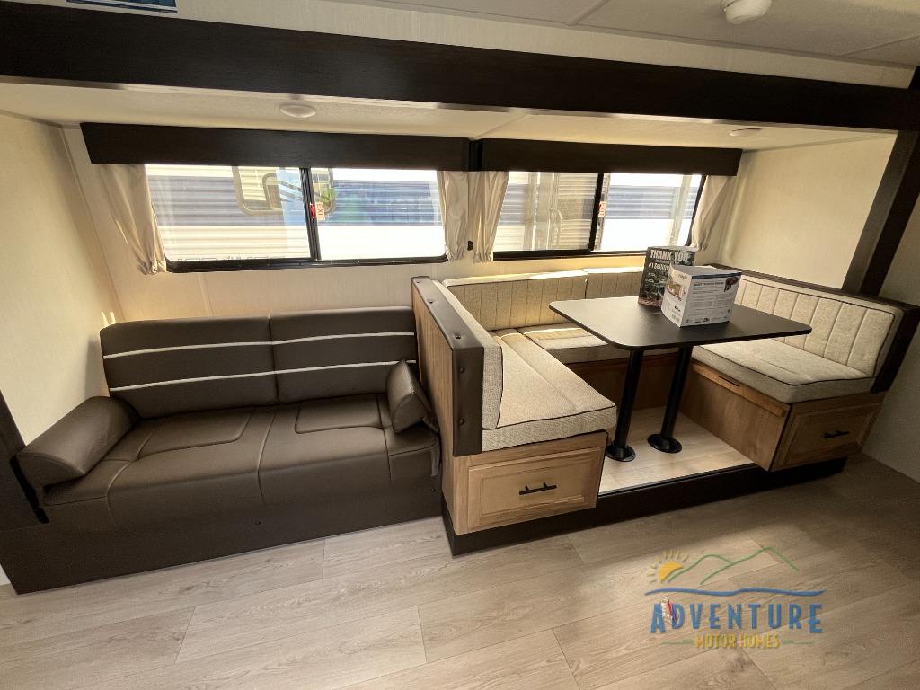 You will love how easy it is to enter/exit this travel trailer with dual entry doors! The rear door leads into the living/kitchen area where you will notice the large U-shaped dinette and the sofa which sit on the slide and create a spacious footprint for moving about, as well as great places to play games and socialize with your friends and family. Plus, there is an entertainment center with a fireplace and a fully equipped kitchen to keep everyone's bellies filled with delicious home cooked meals. At night, there is sleeping space for everyone between the bunks above the sofas with a table in the rear private bunkhouse and the RV king bed in the front private bedroom, plus the furniture can convert into sleeping spaces. The walk-through bathroom leads directly into the bedroom too!