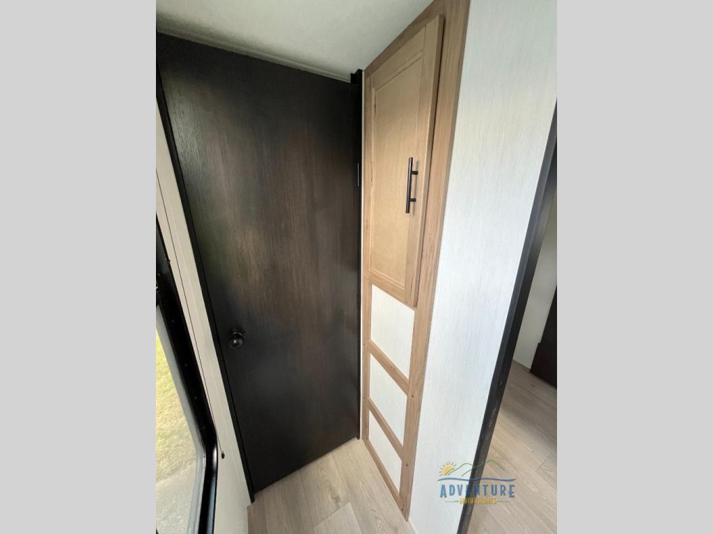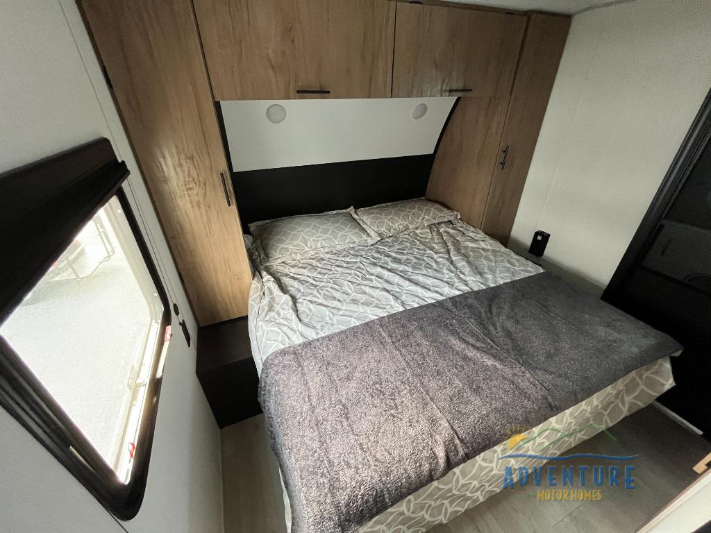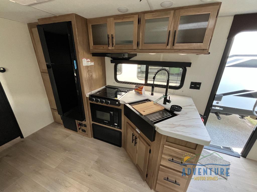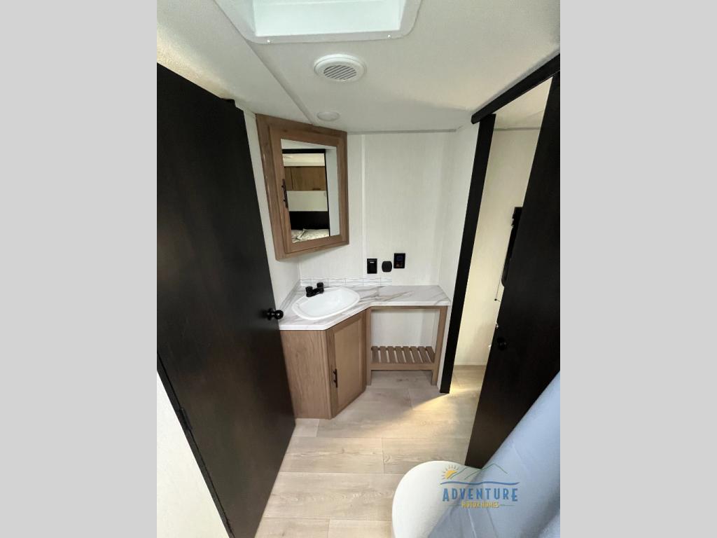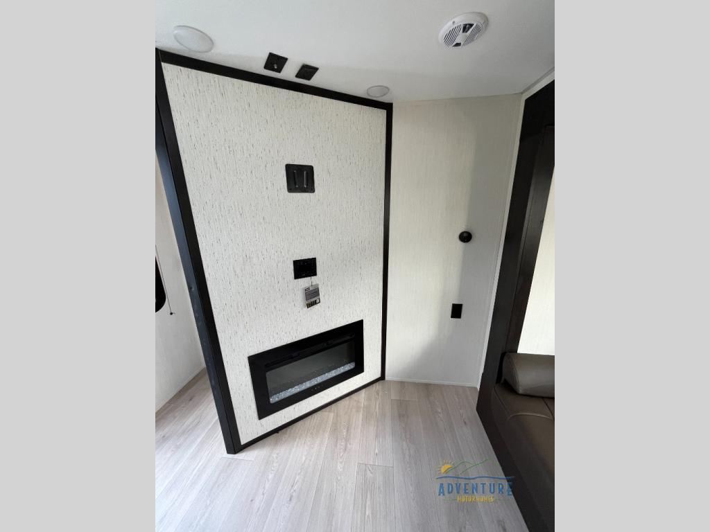You will love how easy it is to enter/exit this travel trailer with dual entry doors! The rear door leads into the living/kitchen area where you will notice the large U-shaped dinette and the sofa which sit on the slide and create a spacious footprint for moving about, as well as great places to play games and socialize with your friends and family. Plus, there is an entertainment center with a fireplace and a fully equipped kitchen to keep everyone's bellies filled with delicious home cooked meals. At night, there is sleeping space for everyone between the bunks above the sofas with a table in the rear private bunkhouse and the RV king bed in the front private bedroom, plus the furniture can convert into sleeping spaces. The walk-through bathroom leads directly into the bedroom too!