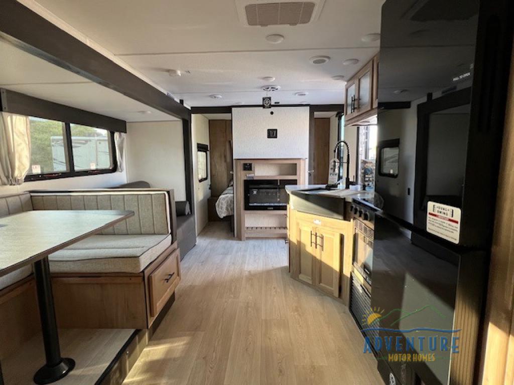 Come on inside this Cherokee Grey Wolf Black Label travel trailer and experience the convenience of a smooth flow of traffic in and out with two entry doors. The rear door leads into a full bath which is great for accessibility when outside and when you need to use the bathroom. Once inside, you will notice the large U-shaped dinette and the sofa which sit on the slide and create a spacious footprint for moving about, as well as great places to play games and socialize with your friends and family. A large pantry provides plenty of storage allowing you to stock up on your favorite snacks and dry goods for your family adventure. At night, there is sleeping space for everyone between the double-size bunks and the RV king bed, plus the furniture.