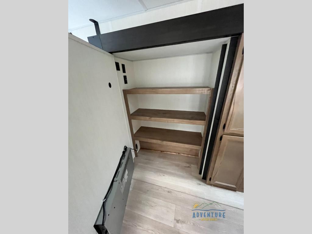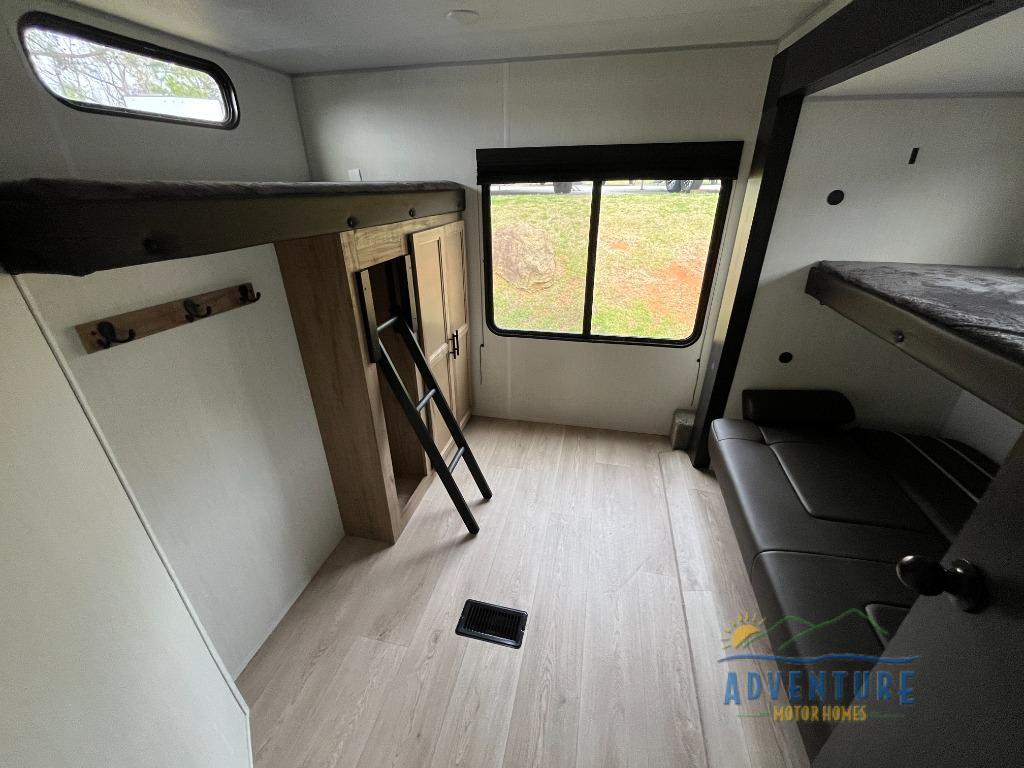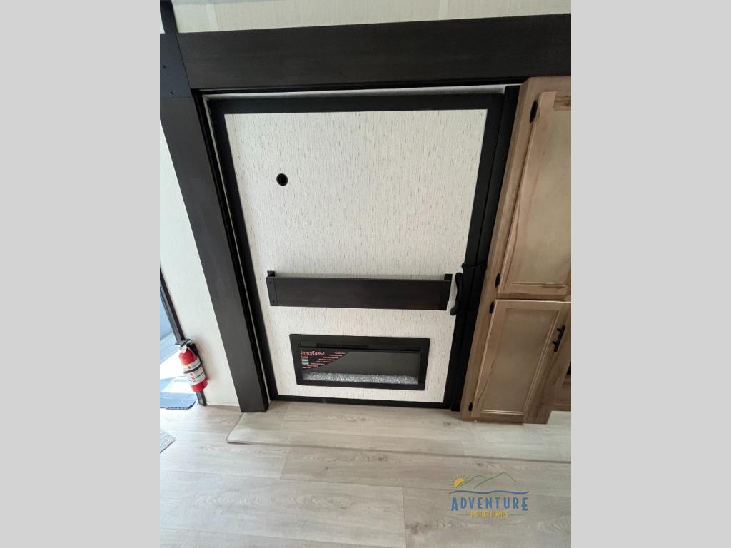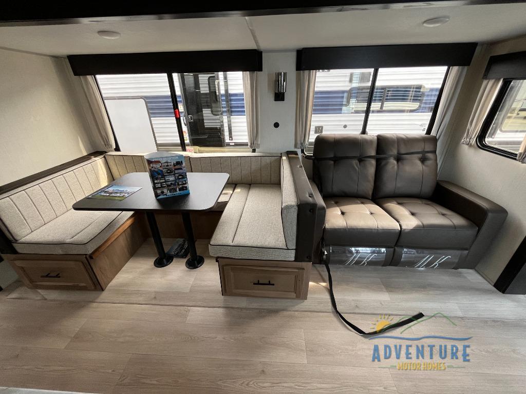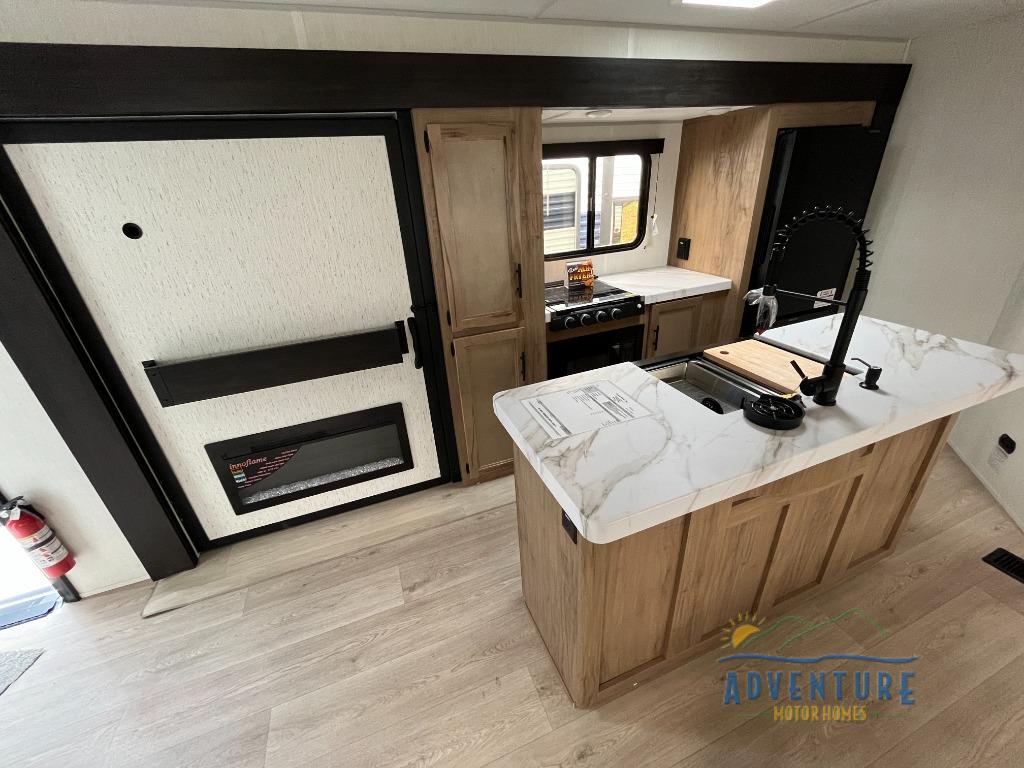 The whole gang will love this travel trailer with triple slides for more space. Your guests or the kids are sure to claim the rear private bunkhouse with a double bunk plus a flip-up bunk above a sofa and a TV mount if you want to add a television here. You'll have the front private bedroom with an RV king bed all to yourselves, and the full bath is close by for easy nighttime use. The middle combined kitchen and living area features dual opposing slides, a kitchen island, plus a U-shaped dinette and sofa. There is also an entertainment center with a fireplace and a hidden pantry behind for movies, snacks and more. Outside, two power awnings, exterior storage, and an outside kitchen makes it easier to spend more time outdoors!