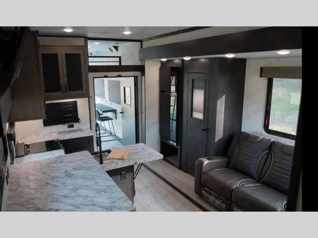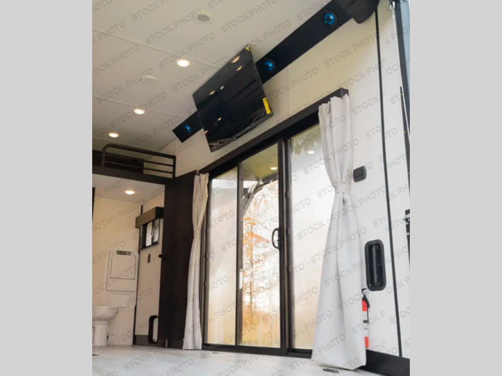 Fun at the campground begins with this dual entry toy hauler in tow! There is a 15' 6" separate garage with glass patio doors, a loft above for guests, a half bath with folding walls and a flip-down recessed bath sink. The combined kitchen and living room features a U-shaped kitchen with a flip-up countertop, a sofa slide out, and a bartop with two stools. There is even an outdoor kitchen on the other side of this counter so you can make breakfast as the sun comes up. A full bath lets you freshen up after a trail ride, and the front private bedroom gives you your own space at night. This unit also features washer and dryer prep in the bedroom so you can add those appliances if you wish!