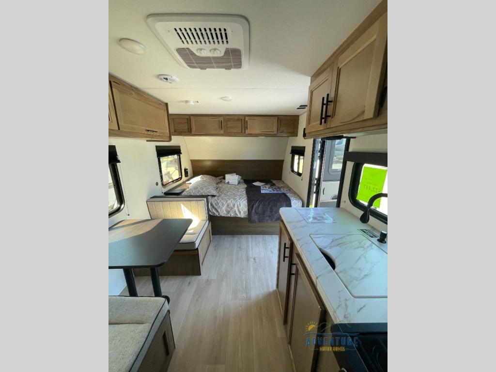The whole family can sleep comfortably in this travel trailer! It has a set of bunk beds for the kids to sleep on, and you can sleep comfortably on the front queen bed with overhead cabinets and a shelf. There is even an exterior storage plus door that accesses the storage space under the bottom bunk. The chef will enjoy preparing their best home cooked meals either indoors with the high output cooktop or at the outside mini kitchen while staying protected by the 12' power awning!