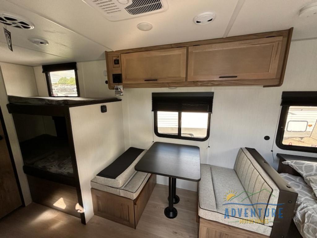 The whole family can sleep comfortably in this travel trailer! It has a set of bunk beds for the kids to sleep on, and you can sleep comfortably on the front queen bed with overhead cabinets and a shelf. There is even an exterior storage plus door that accesses the storage space under the bottom bunk. The chef will enjoy preparing their best home cooked meals either indoors with the high output cooktop or at the outside mini kitchen while staying protected by the 12' power awning!