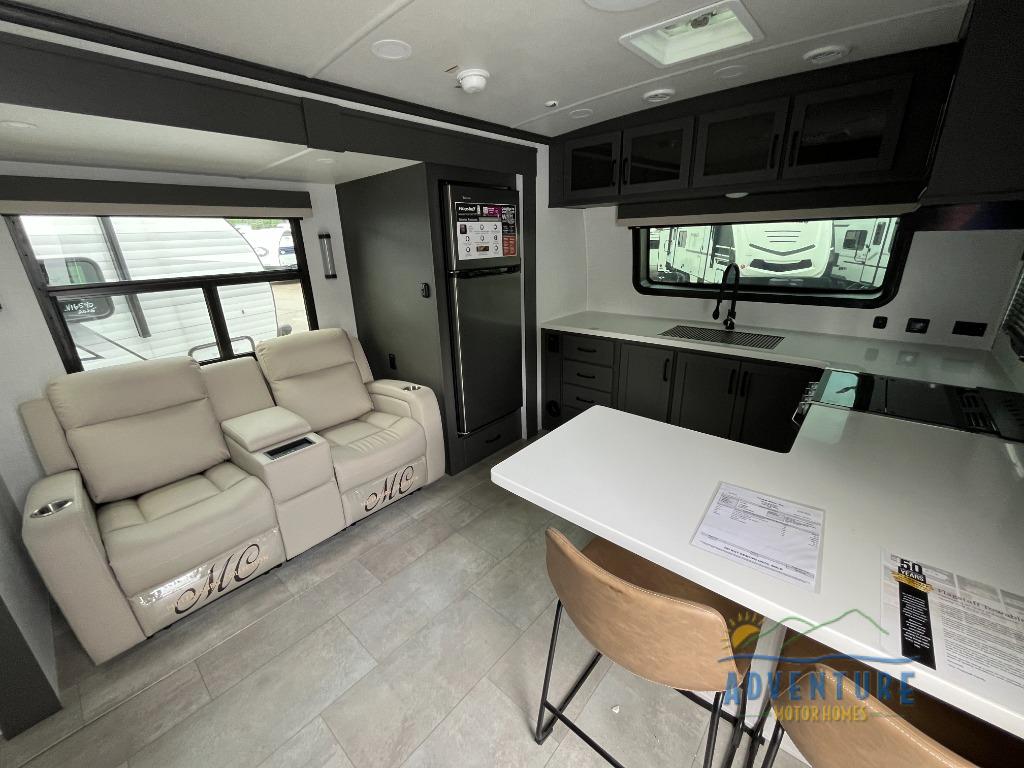You will love how open this travel trailer will feel with the large front window that you can look out from the two-person bar top seating! The front kitchen has plenty of countertop space for you to prepare your best meals. Your nights will be spent in true relaxation with a 67" theater seating and king bed slide in the bedroom for a great night's rest. The full rear bathroom has a shower with a seat to take a nice, hot shower before bed, and a dual-sink vanity for two to get ready at once in the mornings!