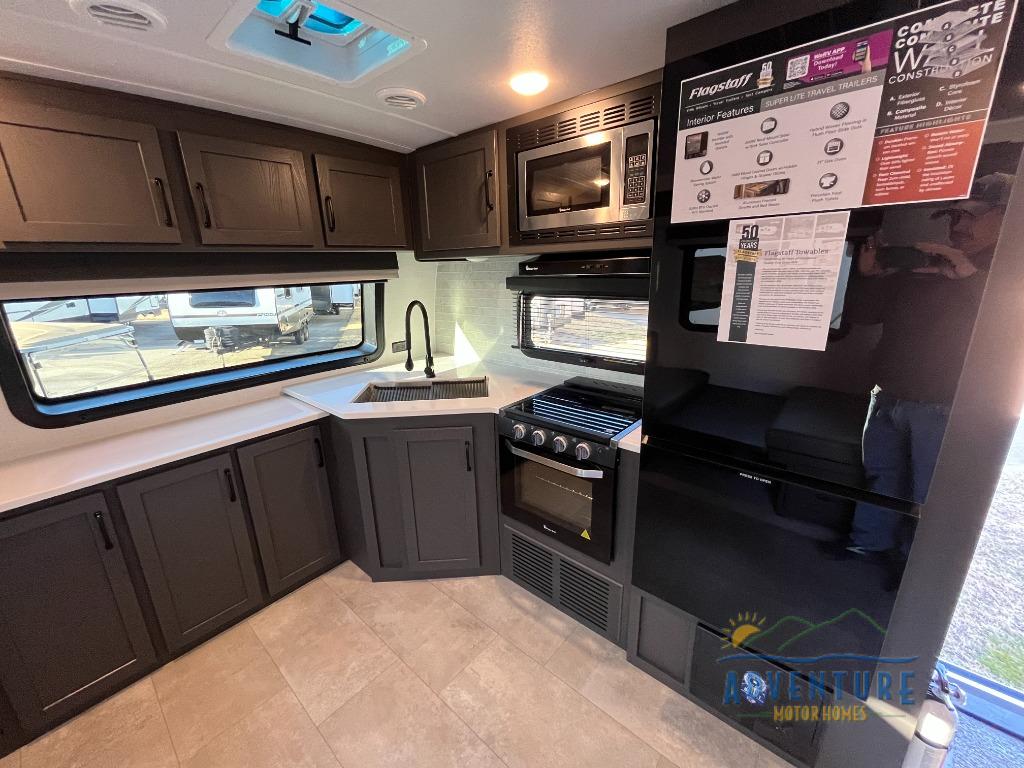 With any Flagstaff Super Lite travel trailer by Forest River the towing features include the TST tire pressure monitor system with a monitor providing safety on the road, Easy Lube axles and Nev-R adjust brakes, a power tongue jack for easy setup, and rear observation camera prep. Each is built with 6 sided aluminum framed side walls, end wall, front, floor and a roof, a plywood tongue and groove subfloor, electronically controlled heated holding tanks and an enclosed underbelly allowing you to travel during any season. The interior includes designer kitchen backsplash, solid surface kitchen countertops, Sedonwood cabinetry, and solid wood cabinet doors and drawers to make you feel right at home.