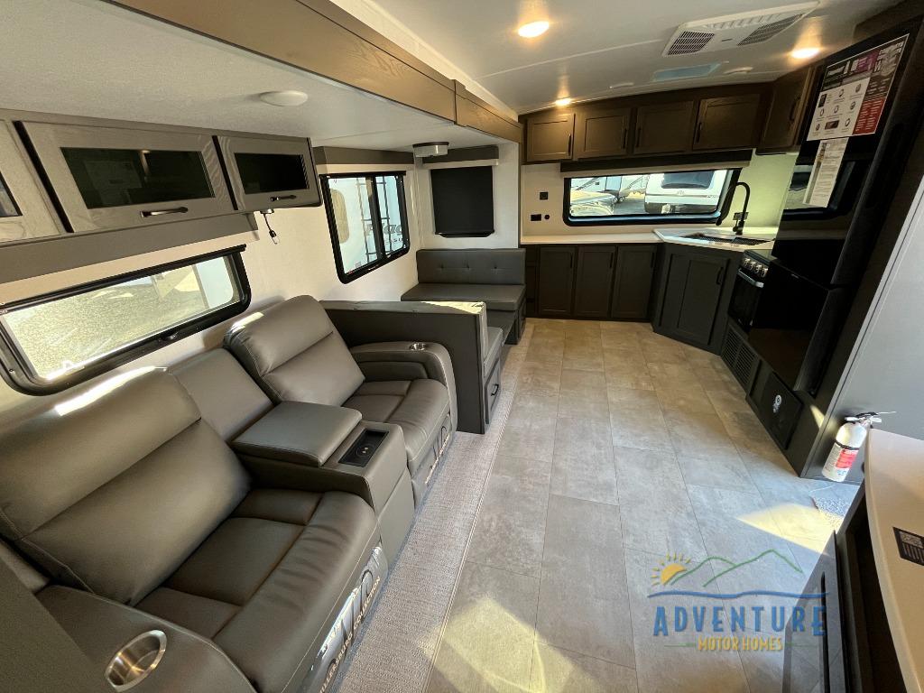 This is the perfect couples trailer with a spacious living and kitchen area and a rear bedroom which includes the second exterior entry/exit door! The bedroom also provides a slide out queen bed, a wardrobe and an optional TV, plus windows for great views and access to the double entry bathroom. The front kitchen gives the cook counter space and cabinetry for dishes and such, plus all the appliances needed to make warm meals and store leftovers. You can dine at the booth dinette, relax on the 67" theater seating and watch the Smart TV while enjoying the fireplace.
