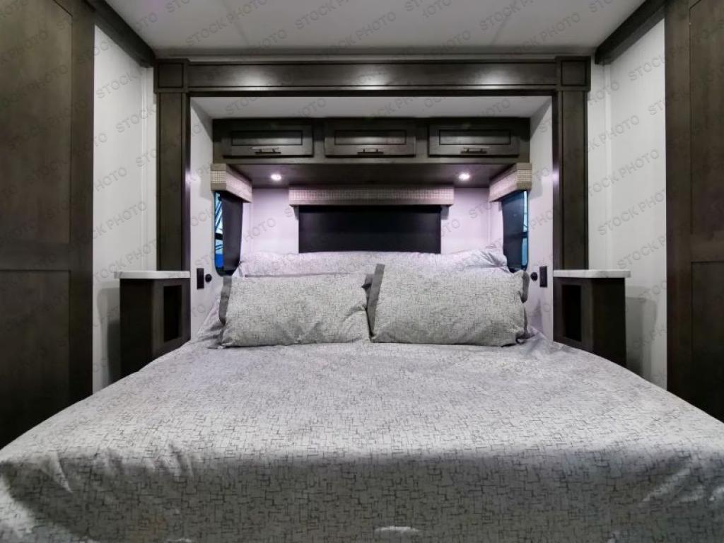 You won't have to search far for comfort in this spacious coach for seven to eight! The little ones will love having bunk beds to sleep on, plus there is a full bath right across the hall for convenience. The master bedroom with a king bed slide out will have you feeling right at home, and the second full bath includes ample counter space to set out your necessities. Everyone can meet in the main living area to relax on the hide-a-bed sofa, or you can choose the optional power theater seats if you don't need more sleeping space. You will surely never get bored with a 40" LED TV in the living room, 32" LED TV in the bedroom, plus a 40" LED TV outdoors with a radio and exterior speakers!