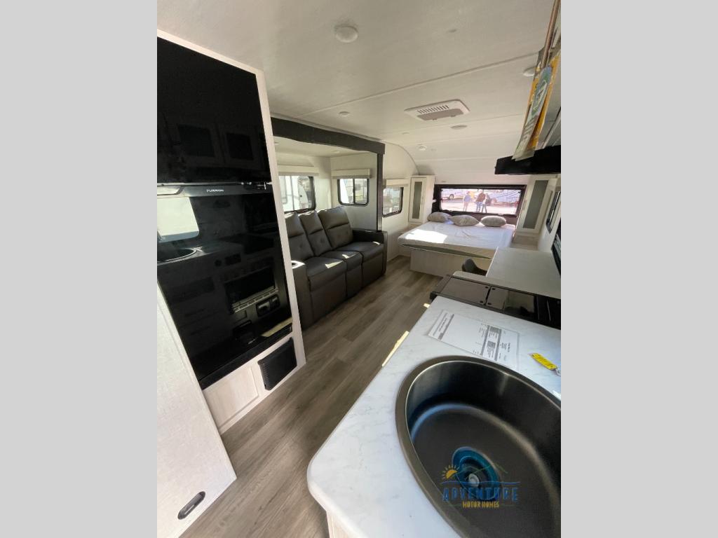 A front bedroom with a walk-around queen bed, a full bath, and a theater seat slide out are a few of the features that you are sure to want in your next RV! You can rest comfortably each night, plus all your clothing can be stored in the dual wardrobes to keep everything tidy. If you're needing more sleeping space, just choose the optional tri-fold sofa or optional booth dinette in place of the theater seat! The chef of your group can make meals on the two burner cooktop or in the convection microwave, and there is a 12V black glass refrigerator for perishables. And the bar top with two seats and the flip-up window provide a great view outdoors as you dine together.