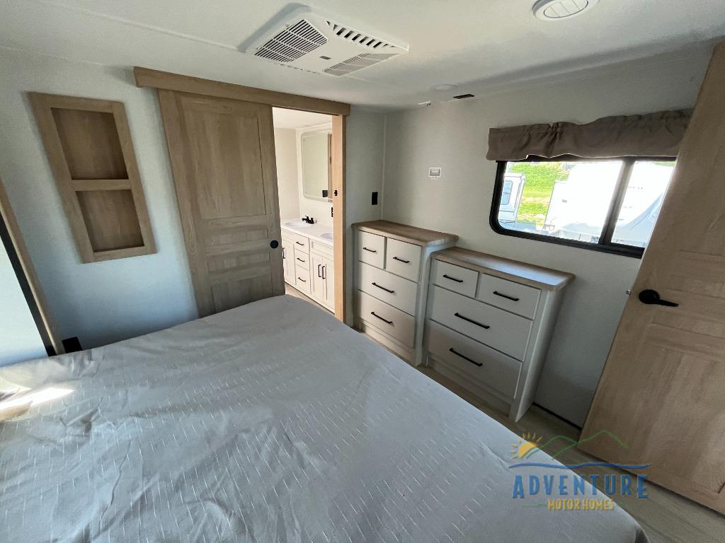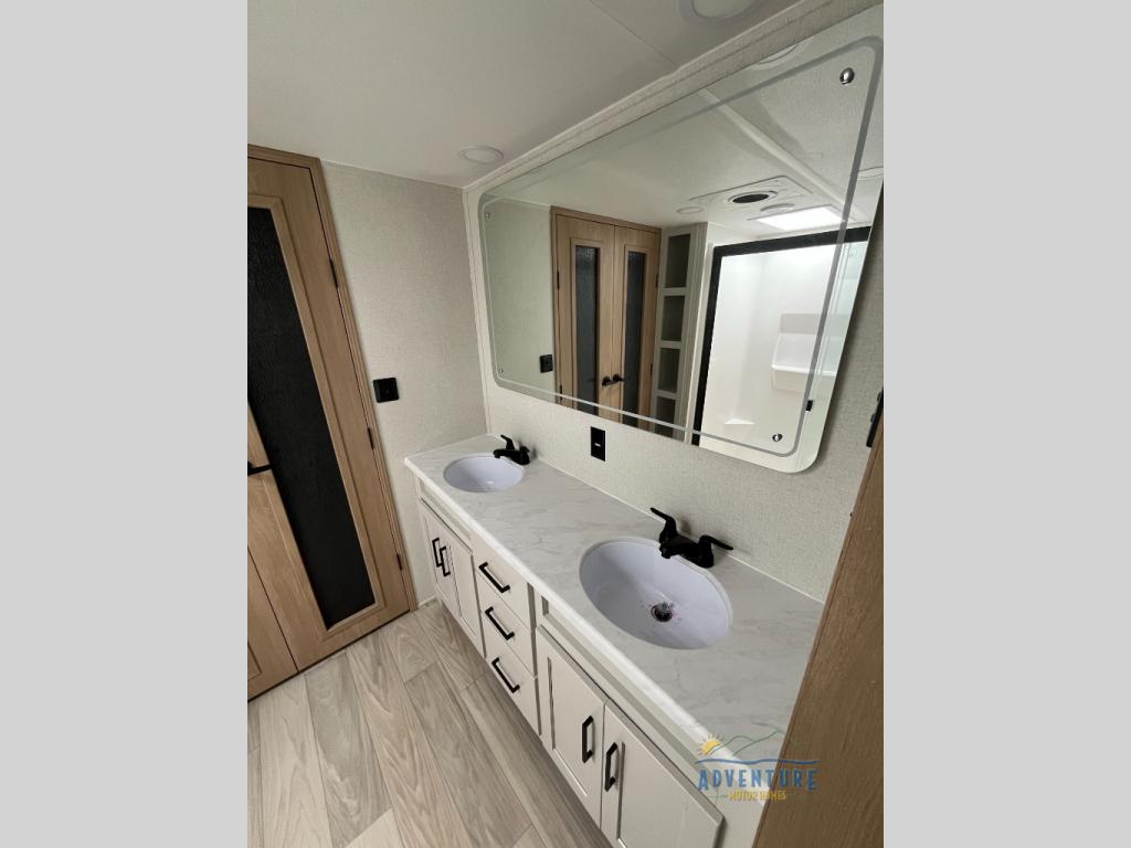 It will be easier than ever to enjoy camping trips in this triple slide out fifth wheel, or even go full-time! The combined kitchen and living area features dual opposing slides for ample space, an L-shaped sofa with a chaise lounge, and a fireplace with a hidden pantry behind for snacks! A desk with a chair and a USB port will provide a place to work if you need to send some emails, and the large kitchen island will give you ample room to prep dinner when you get hungry. There are also pendant lights here, along with a waterfall edge and barstools for dining space. The mid-coach half bath includes a toilet, sink, plus washer and dryer prep, giving you the option to make this the perfect laundry room! The master bedroom up front may be your favorite place to unwind in this unit. There is a king bed slide, a small dresser plus a tall dresser, and a TV hookup if you want the option to watch movies in bed. And you'll be wowed by the front master bedroom with its fiberglass shower with a seat, dual bath sinks, and large walk-in closet!