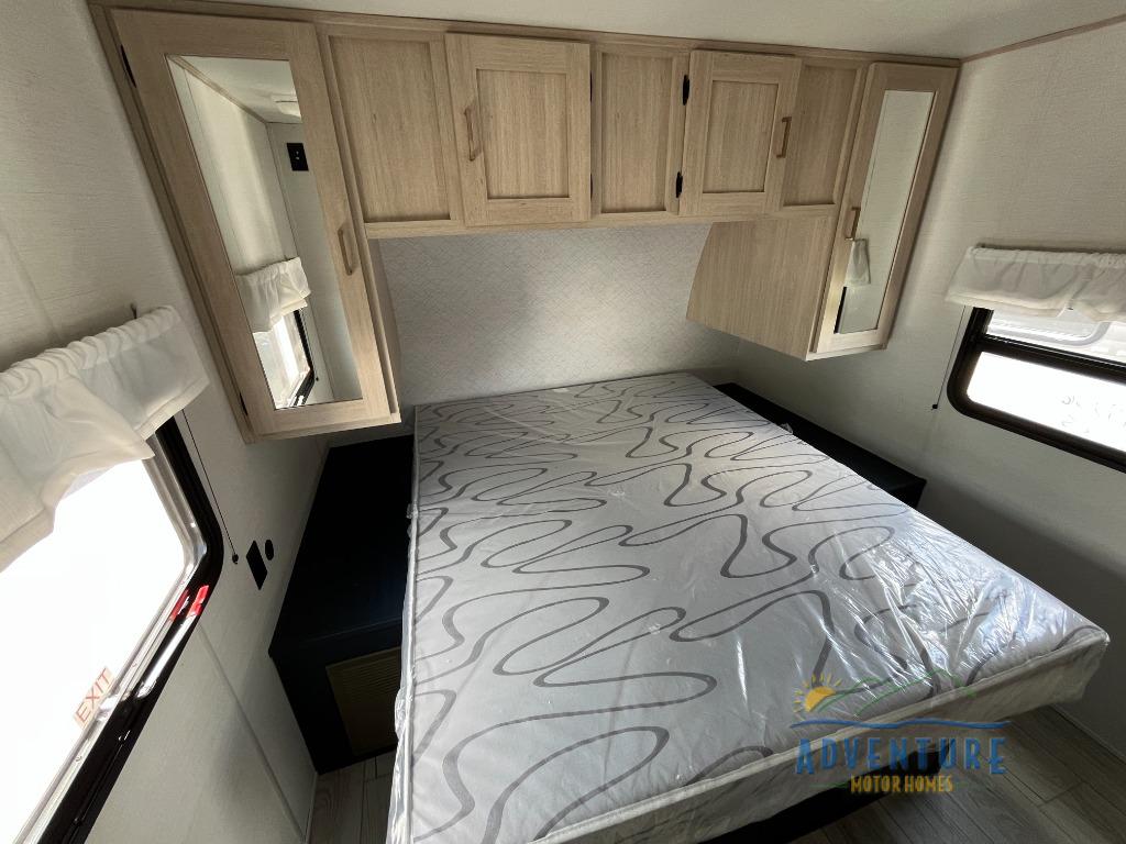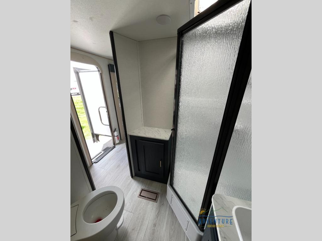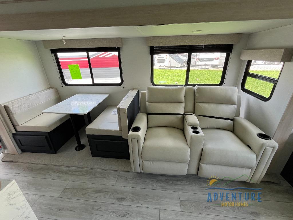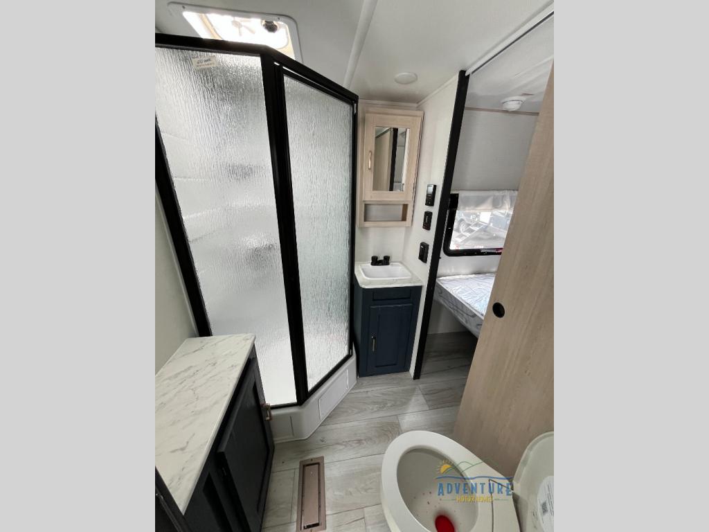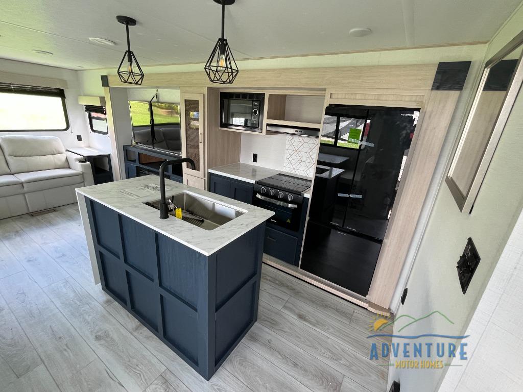 A couple or family will enjoy all the space in the main living and kitchen area, and the privacy in the front bedroom. As you spend each night sleeping on the queen-size bed in the master suite, you will appreciate the convenience of discreetly entering the full bathroom with a neo-angled shower without waking up your guests who are sleeping on the sofa or booth dinette. Because there are two opposing slides included in the central living area, there is plenty of space to prep dinner or wash dishes on the kitchen island.
