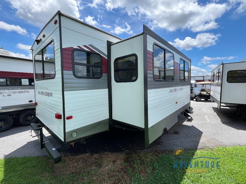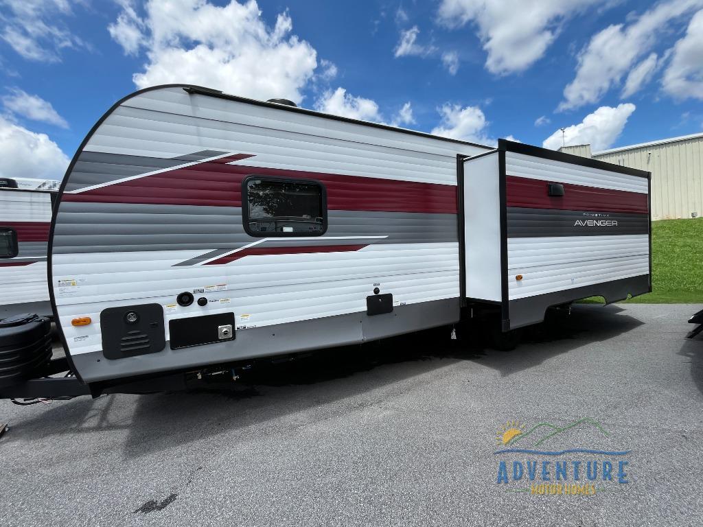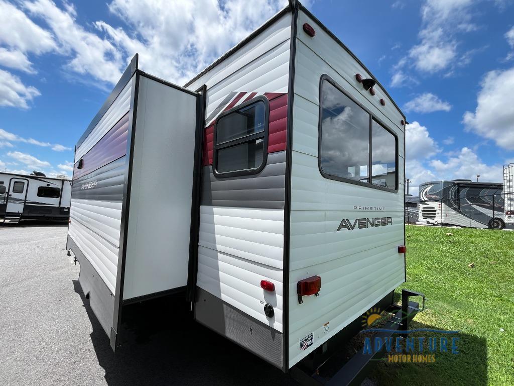 With any Avenger travel trailer by Prime Time, the exterior includes an aerodynamic smooth front metal, a diamond plate front rock guard for protection on the road, and four stabilizer jacks to keep your unit secure. There is a fully walkable roof plus an enclosed and heated underbelly that will help extend your camping season. The interior offers a 15,000 BTU air conditioner for the perfect climate inside, in-floor ducted heat, a systems monitor panel, and a Winegard 360+ antenna with Wi-Fi prep that will give you the option to stay connected as you camp. Each model also includes seamless Carefree Congoleum flooring, kitchen backsplash, shower pans in all models, and pleated nightshades throughout to name a few interior comforts!