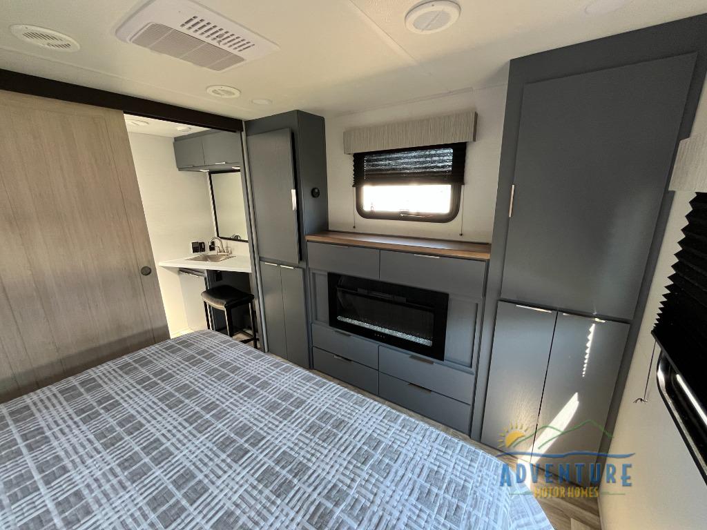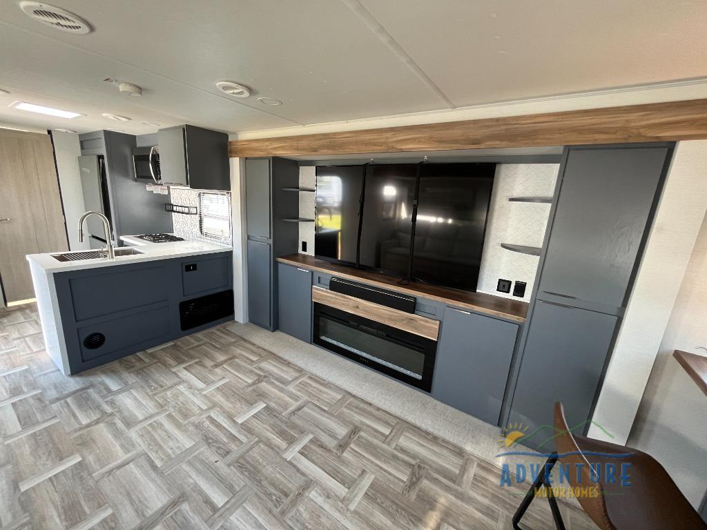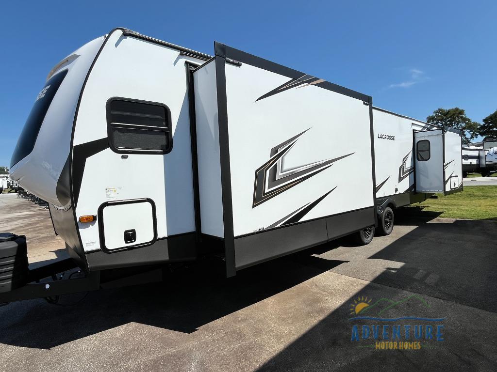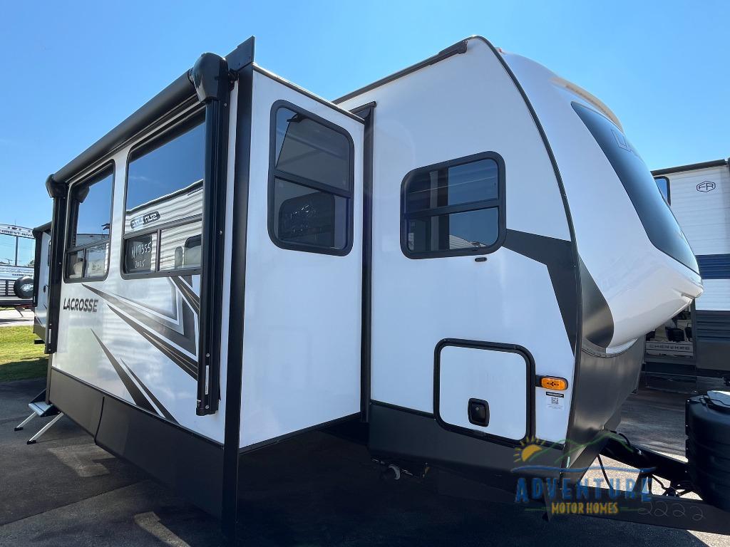 This Lacrosse travel trailer is made for entertaining! The living room is a standout with its unique bar seating at the large front window. This is perfect for eating and drinking, or use it as desk space to work from the road. The sofa sits in its own slide out for extra comfort, and has a great view of the enormous entertainment center with fireplace and 70" TV. A second fireplace warms up the rear bedroom, which also features a king bed slide for maximum floor space. There's a full bath, a well-equipped kitchen, and plenty of storage space. Invite your friends along for a great time!