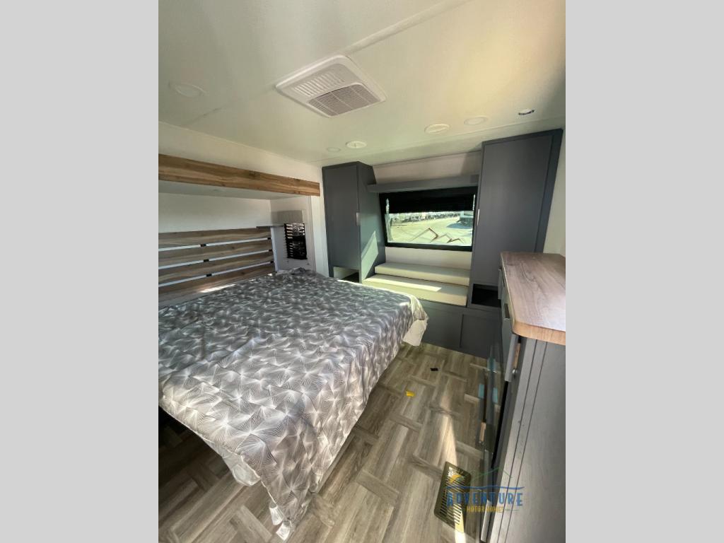 Privacy abounds in this travel trailer with a bedroom at each end! A king bed slide in the front has its own fireplace for cozy nights. Dual wardrobes frame the reading bench which looks out the front window for peaceful moments appreciating the view. At the rear, a second bedroom with queen bed has its own half bath. A pantry closet here also has prep for an optional washer/dryer for convenience on the road. In the center everyone can meet up in the spacious kitchen/living room. A hide-a-bed sofa has even more sleeping space, or relax there and watch the TV which is in the entertainment center along with another fireplace. The kitchen is well-equipped with a three-burner cooktop, microwave, and even an island where the sink is located for easy meal prep. Outside there are not one but two 10' power awnings for extra protection from the elements!