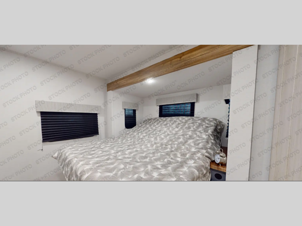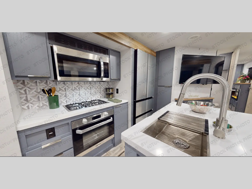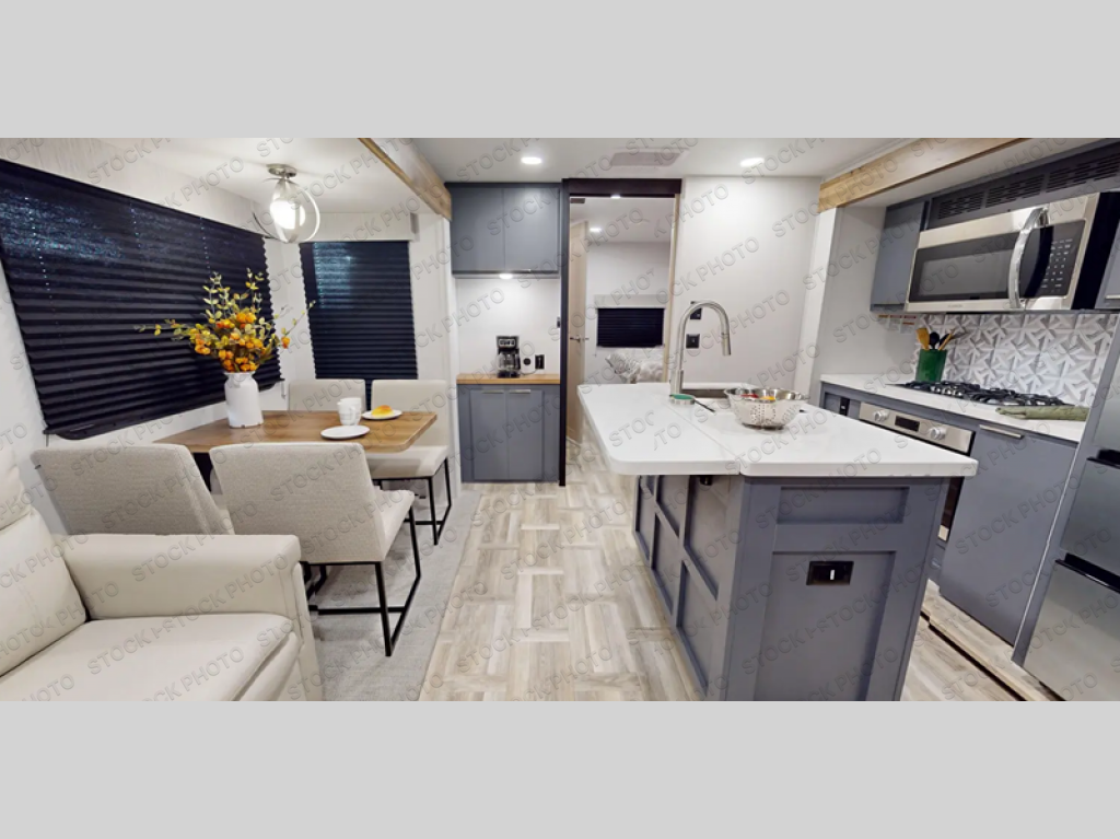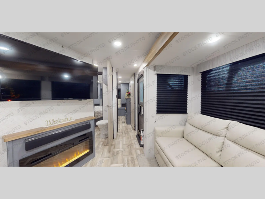 Privacy abounds in this travel trailer with a bedroom at each end! A king bed slide in the front has its own fireplace for cozy nights. Dual wardrobes frame the reading bench which looks out the front window for peaceful moments appreciating the view. At the rear, a second bedroom with queen bed has its own half bath. A pantry closet here also has prep for an optional washer/dryer for convenience on the road. In the center everyone can meet up in the spacious kitchen/living room. A hide-a-bed sofa has even more sleeping space, or relax there and watch the TV which is in the entertainment center along with another fireplace. The kitchen is well-equipped with a three-burner cooktop, microwave, and even an island where the sink is located for easy meal prep. Outside there are not one but two 10' power awnings for extra protection from the elements!
