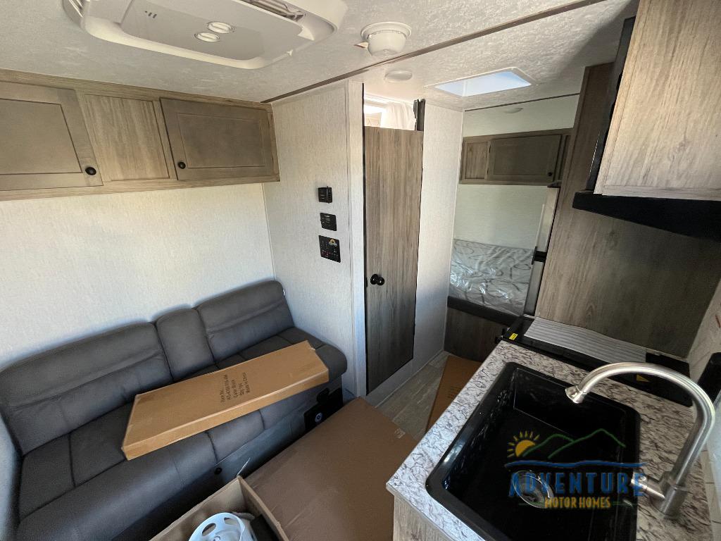 This compact travel trailer will be perfect for trips to the lake. Since there is a front bed, you won't have to sleep on an air mattress, and the convenient wet bath lets you freshen up each day. Breakfast can be made on two burner cooktop or in the microwave oven, and there is a refrigerator to keep your food fresh. This model also includes a sofa where you can relax in the evenings, and guests can sleep here if they want to tag along!