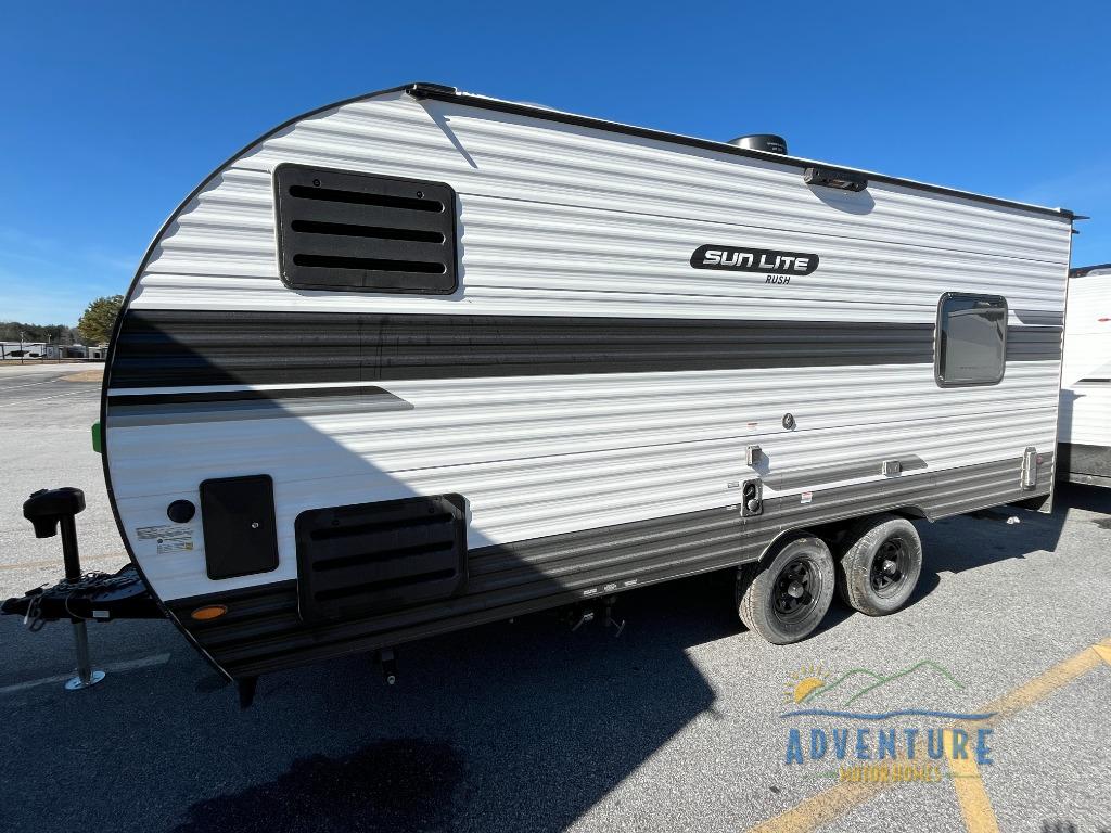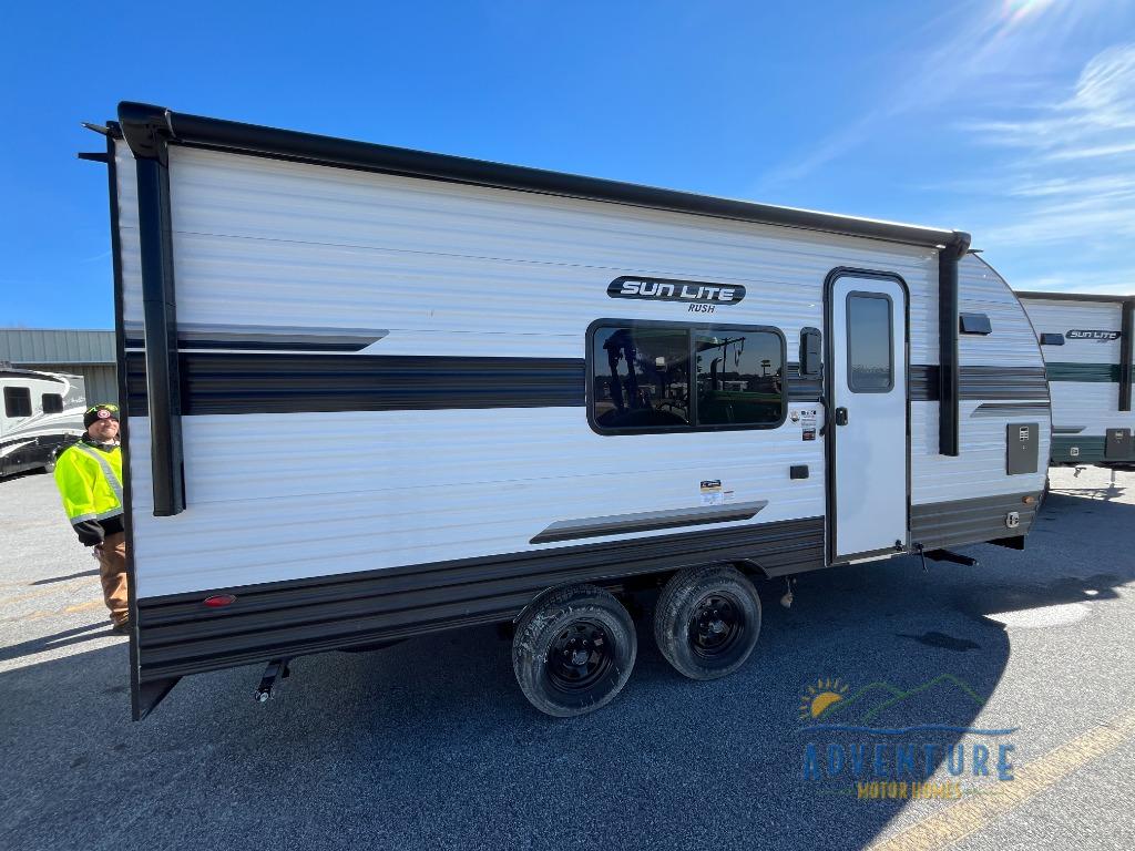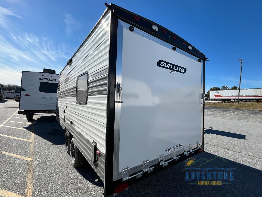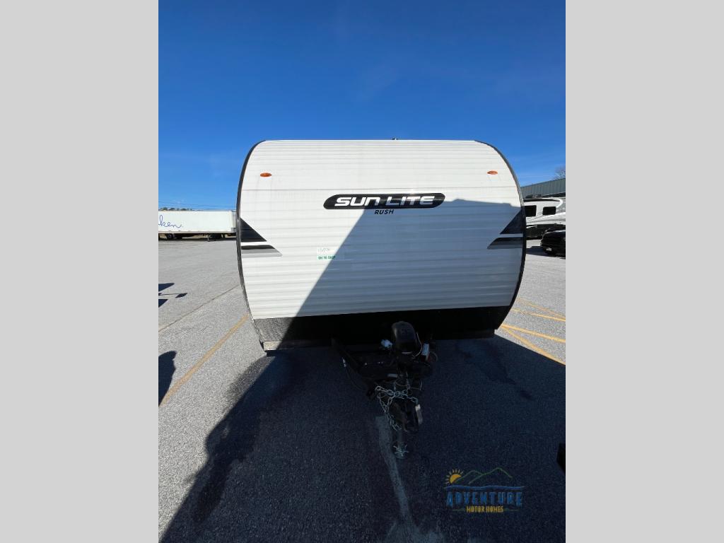 You can trust the build and enjoy your experience with any one of these Sunset Park RV Sun Lite travel trailers or toy haulers! Their aerodynamic profile is not only easy to haul, but also saves on fuel. They are built to withstand years of traveling even though they are lightweight with a diamond plate rock guard, a one piece PVC roof membrane, Dexter Spring-Leaf axles, and tinted safety glass windows. Some comfort standards you are sure to enjoy are the two-burner stove top range with hood, light and fan, plus the refrigerator and microwave, and an outside shower to help keep the dirt outdoors where it belongs.