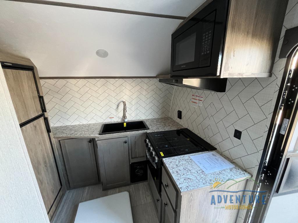 You can trust the build and enjoy your experience with any one of these Sunset Park RV Sun Lite travel trailers or toy haulers! Their aerodynamic profile is not only easy to haul, but also saves on fuel. They are built to withstand years of traveling even though they are lightweight with a diamond plate rock guard, a one piece PVC roof membrane, Dexter Spring-Leaf axles, and tinted safety glass windows. Some comfort standards you are sure to enjoy are the two-burner stove top range with hood, light and fan, plus the refrigerator and microwave, and an outside shower to help keep the dirt outdoors where it belongs.