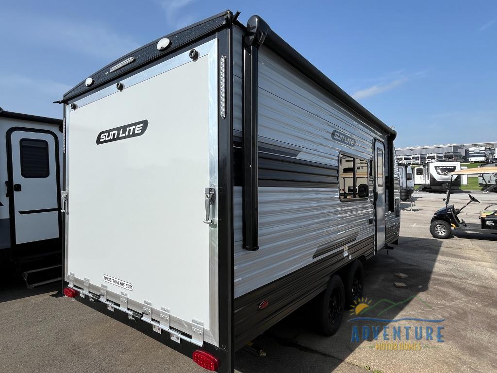 You can trust the build and enjoy your experience with any one of these Sunset Park RV Sun Lite travel trailers or toy haulers! Their aerodynamic profile is not only easy to haul, but also saves on fuel. They are built to withstand years of traveling even though they are lightweight with a diamond plate rock guard, a one piece PVC roof membrane, Dexter Spring-Leaf axles, and tinted safety glass windows. Some comfort standards you are sure to enjoy are the two-burner stove top range with hood, light and fan, plus the refrigerator and microwave, and an outside shower to help keep the dirt outdoors where it belongs.