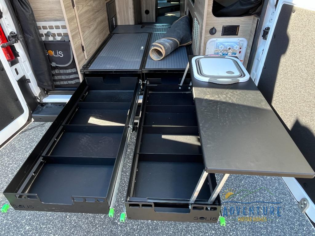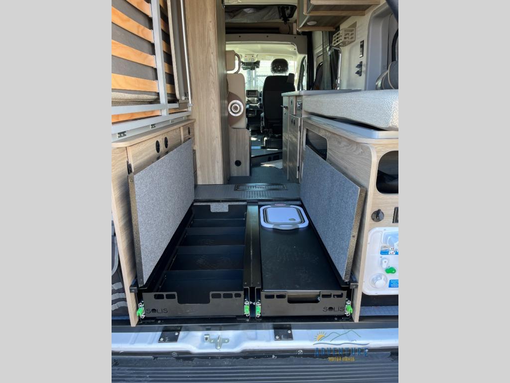 Each Solis Class B gas motorhome by Winnebago sits upon a fuel-efficient Ram ProMaster chassis with a 3.6L V6 engine to power your adventures. You will love the cab conveniences that make each trip enjoyable, like the radio/review monitor system touchscreen and the crosswind assist to keep you steady on the road. Some of the hassle-free amenities you will appreciate are the exterior wash station, the Eco-Hot water system, and the water center control panel located inside the right rear door. Head indoors to find heavy-duty vinyl flooring throughout, a laminate countertop and a stainless steel sink in the galley, plus tinted coach windows for added privacy. The Solis also features off-grid capabilities with its two deep-cycle Group 31 batteries and 220-watt flexible surface solar panel with a controller. Adventures awaits in the Solis Class B gas motorhome!