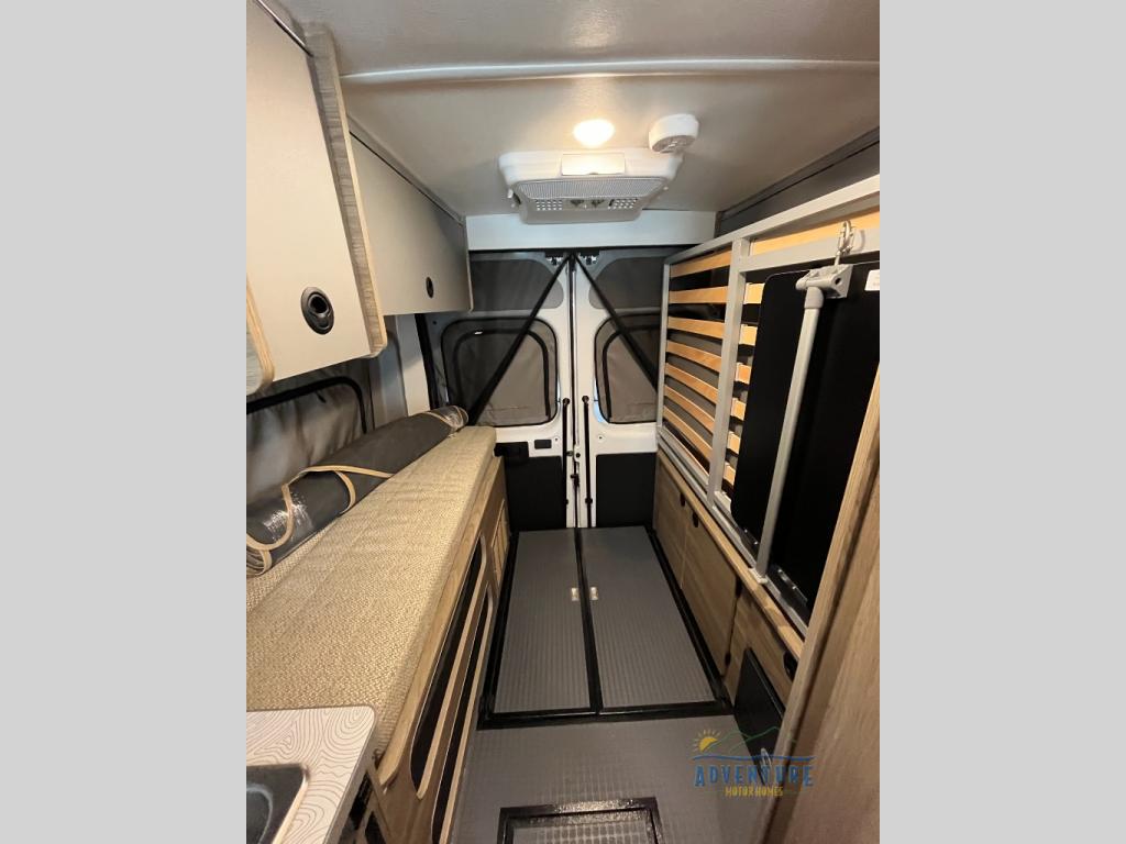 Enjoy a weekend ride in the mountains or make it an overnight stay with versatile sleeping options in this camper van. You'll find the Murphy+ bed in the back will provide a great night's rest, or you can choose the optional sofa/bed with added belted seating if you have more tag-alongs. And of course the little ones will love the pop-top sleeping area to climb into each night. After you've freshened up in the convenient wet bath, prepare breakfast on the two burner range, and the milk and eggs can go back in the 3.0 cu. ft. single door refrigerator/freezer. This model also includes rear double doors with screens to let the breeze in and keep bugs out!