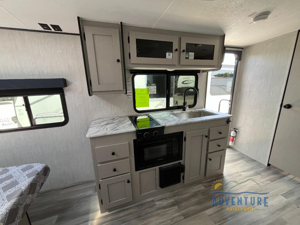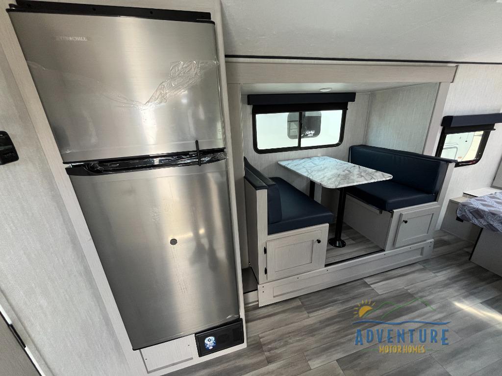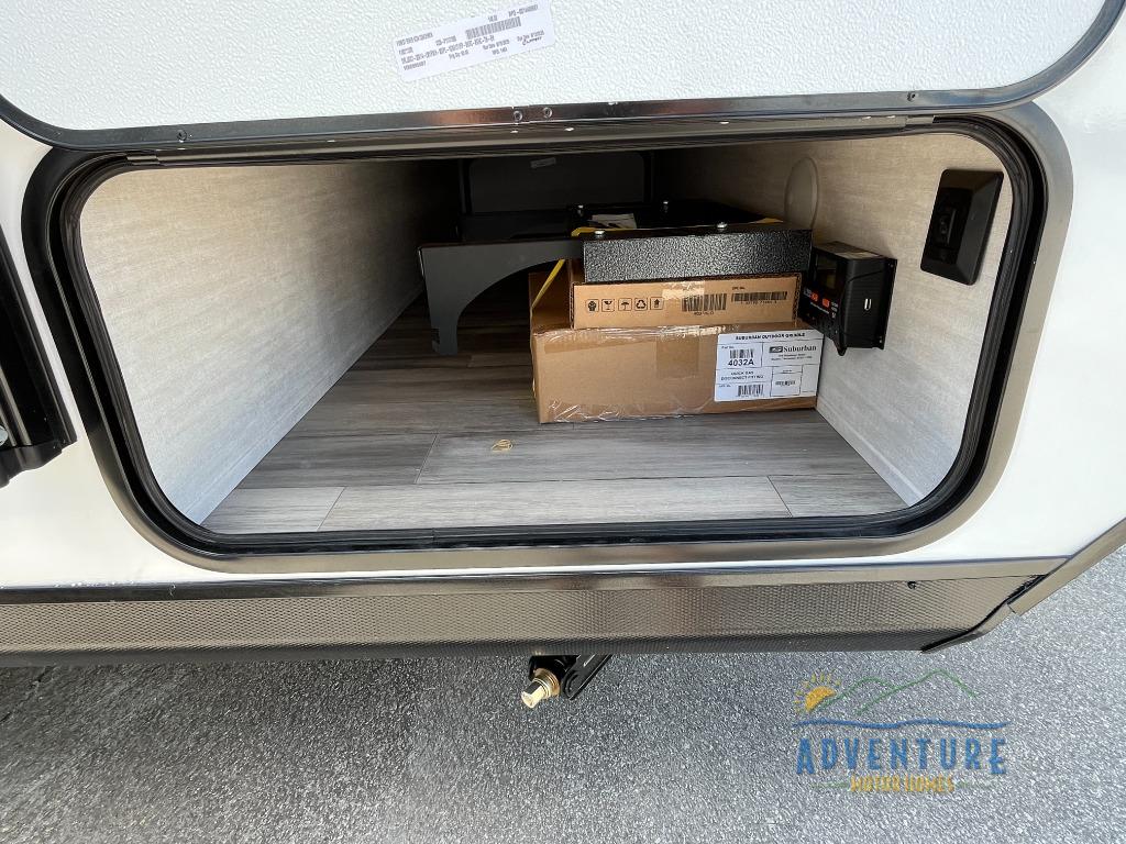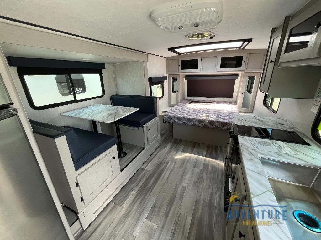 Whether you camp with friends, family or solo, this trailer gives you space for all with a spacious main living and kitchen area thanks to the booth dinette slide! The rear full bath offers a shower, sink, toilet and a wardrobe so you can get ready in privacy. A two burner cooktop and microwave underneath will let you make meals each day, and the 12V refrigerator will be perfect for perishables. The walk-around queen-size bed provides convenience when getting in and out of bed and there are two wardrobes and overhead cabinets to keep your belongings up and away. The power awning protects you from the elements when relaxing outside, and the exterior pass-through storage gives you a place to stow the outdoor equipment like camping chairs, tables, fishing poles and charcoal.