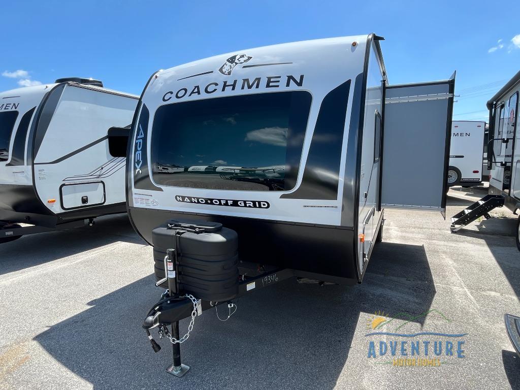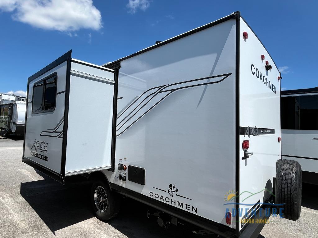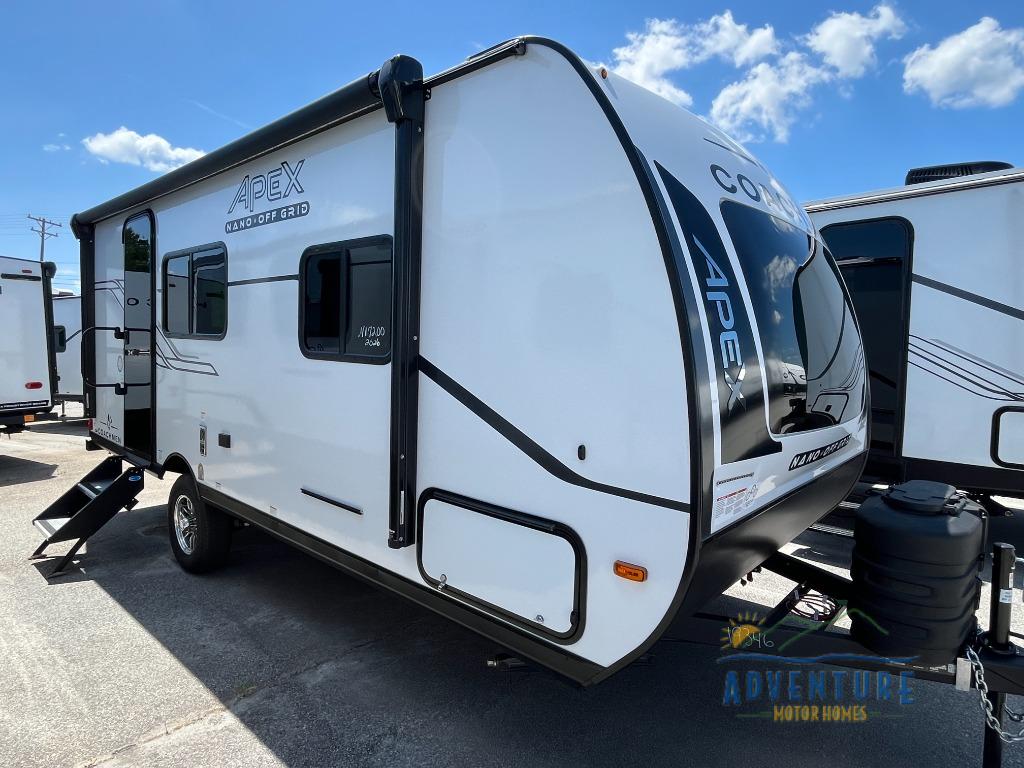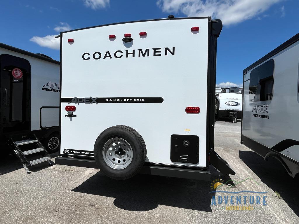 You will find comfort, convenience, and a sturdy construction with each of these Coachmen RV Apex Nano travel trailers! They are held together with an aluma-cage construction, an I-beam chassis, plus vacuum-bonded laminated dual Azdel fiberglass walls for double the protection against the elements. The 200-watt solar panel with a 30 amp control charger is included within the Off-Grid Package, along with two 20 lb. LP tanks, a high velocity power roof vent, plus 12V outlets to keep you powered up. More exterior feature include a hot/cold shower, four stabilizer jacks, a power awning with LED lighting, and magnetic baggage door catches to easily pack and unload your gear. You will love the interior of your Apex Nano with Congoleum residential flooring, one-piece seamless edge countertops, matte black hardware in the galley, and a hand-crafted wood medicine cabinet in the bath.