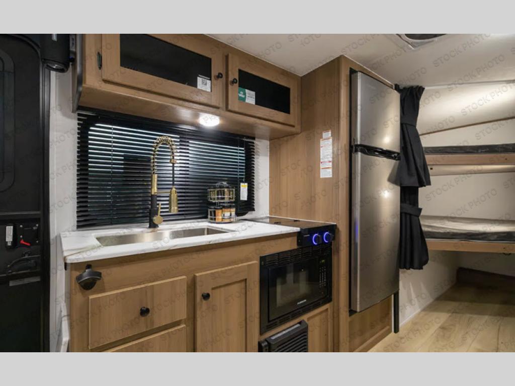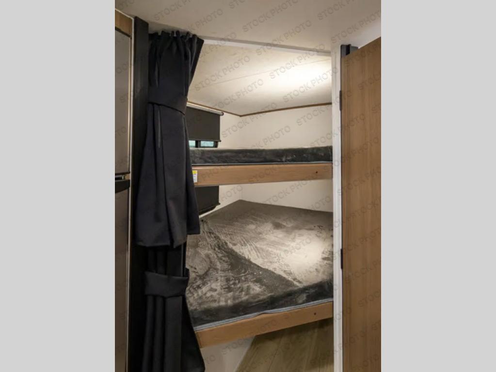 You and a few friends or family members can camp comfortably in this travel trailer! It features a front queen bed with wardrobes on either side to keep your clothes out of the way or you can switch it out for the optional Murphy bed for more versatility. Two others can sleep on the rear corner upper double bed and lower flip up double bed. After you have fried up some eggs on the two burner cooktop and heated up a piece of banana bread in the microwave, you can head to the booth dinette slide to enjoy it. There is even a pantry to store your coffee grounds and snacks. Now that your bellies are full, you can freshen up in the rear corner bathroom with the tub/shower.