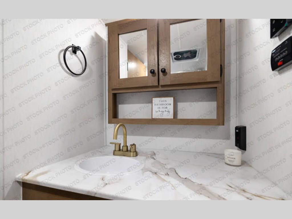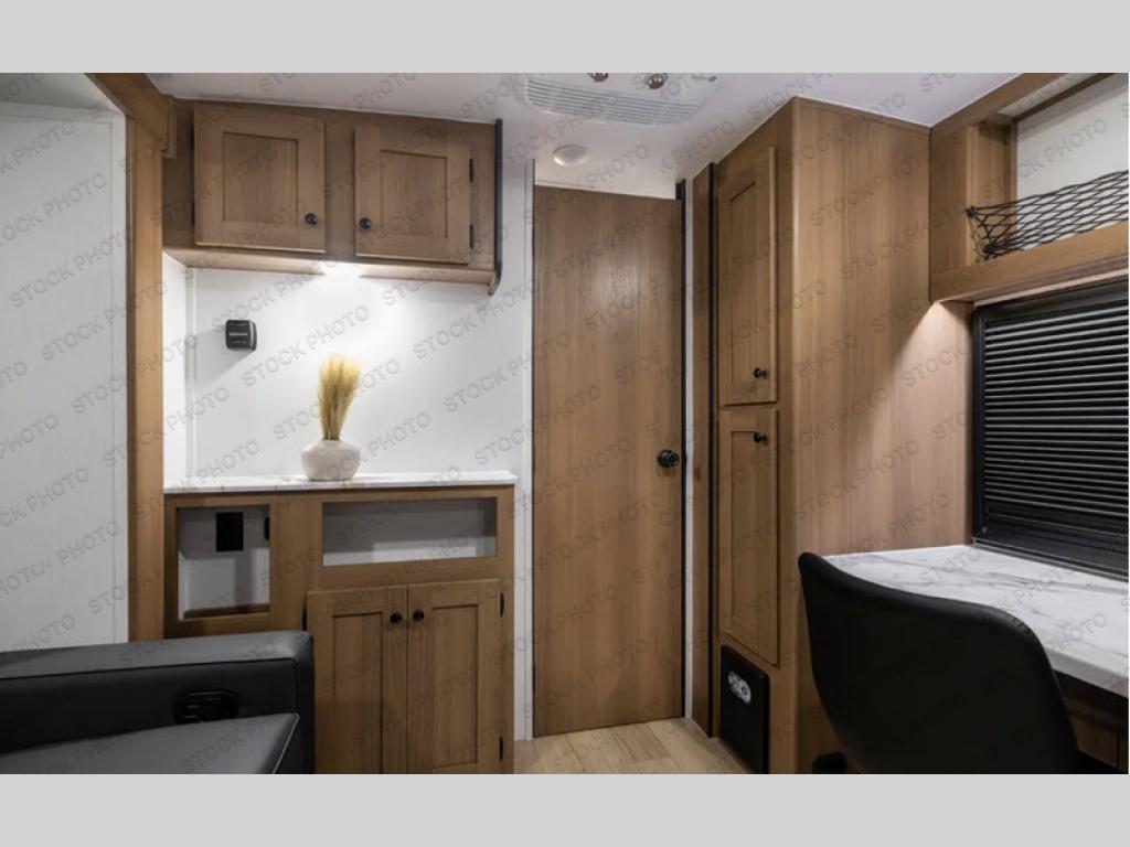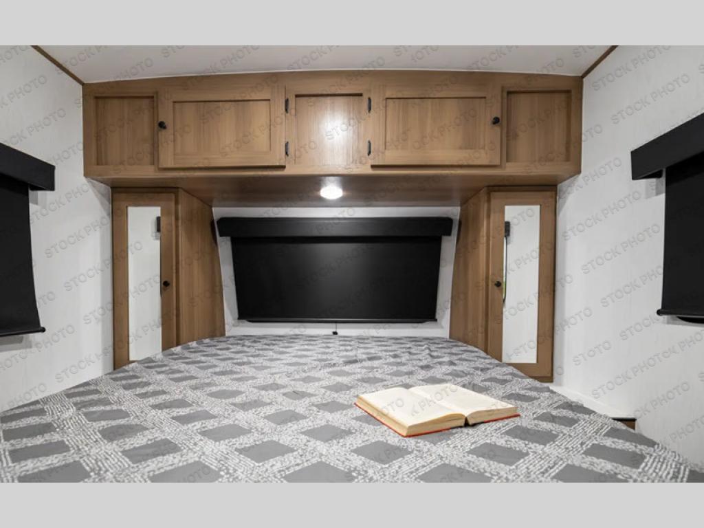 As you step inside, you’re welcomed by a spacious rear kitchen that spans the full width of the trailer, making meal prep both convenient and enjoyable. The kitchen is equipped with a stainless-steel sink featuring a flush mount cover for added counter space, a 2-burner cooktop, an air fryer microwave, and a 10 cu. ft. refrigerator, perfect for storing all your groceries. A pantry adds even more storage for dry goods and kitchen essentials. Just in front of the kitchen, a Bar-V counter with chairs offers a great spot to dine, work, or relax with company. Across from the counter, a comfortable sofa slide provides a cozy lounging area and can also convert into an extra sleeping space when needed. Moving forward, the walk-through bathroom features a shower, a skylight for natural light, and a foot flush toilet for added convenience. At the front of the trailer, the private bedroom includes a queen bed flanked by wardrobes on each side, offering both comfort and practical storage for all your essentials.