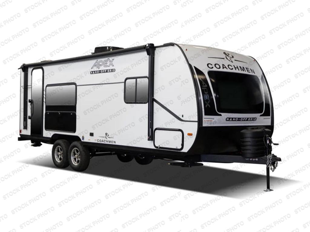 You will find comfort, convenience, and a sturdy construction with each of these Coachmen RV Apex Nano travel trailers! They are held together with an aluma-cage construction, an I-beam chassis, plus vacuum-bonded laminated dual Azdel fiberglass walls for double the protection against the elements. The 400-watt solar panel with a 30 amp control charger is included, along with two 20 lb. LP tanks, a high velocity power roof vent, plus 12V outlets to keep you powered up. More exterior features include a hot/cold shower, four stabilizer jacks, a power awning with LED lighting, and radius thumb latch baggage doors to easily pack and unload your gear. You will love the interior of your Apex Nano with Congoleum residential flooring, one-piece seamless edge countertops, matte black hardware in the galley, and a hand-crafted wood medicine cabinet in the bath.