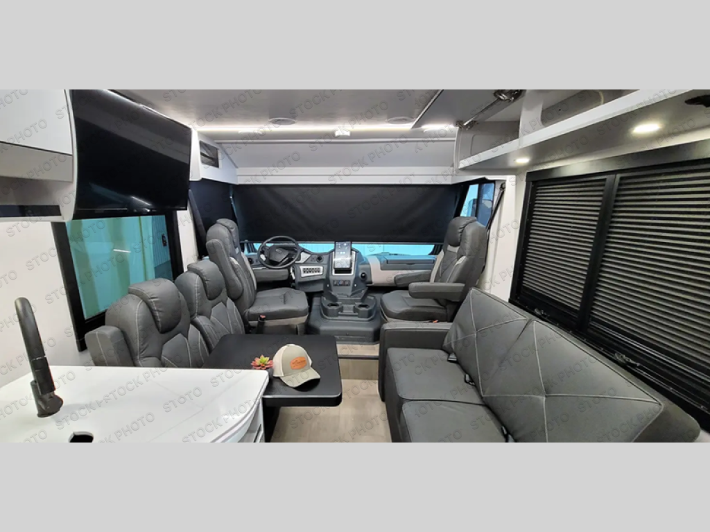 Come travel the state or country in this cozy coach! Once you arrive at your destination, the reclining/swivel pilot seats can become a part of the living area where your crew is relaxing on the sofa and two chairs with a table. You'll find an induction cooktop in the kitchen to prepare meals, plus a stainless steel double door refrigerator and a pantry to hold food for the whole week. A king bed slide out in the rear corner bedroom will have you feeling right at home, and there is a bedroom TV to watch movies in bed plus power outlets on both sides of the bed to charge your phone at night. Having a full bath onboard is sure to come in handy, especially with its glass shower door, skylight, and on-demand water heater. This model also includes two closets, one with washer and dryer prep to keep your clothes wrinkle-free plus more storage space throughout for camp gear and necessities!