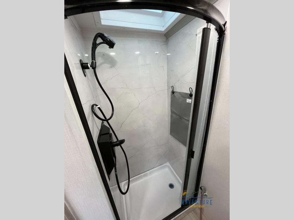 Enjoy a home away from home with this motorhome! The rear private bedroom has a queen bed slide for more interior space and privacy curtains to draw at night. If you need more sleeping space, just add the optional cab over bunk. The booth dinette slide is not only great for enjoying meals and play card games, but can also transform into an extra sleeping space. You could also switch it out for the optional theater seating to meet your specific needs. The bathroom has a shower with a skylight above for added natural lighting and an Oxygenics body spa RV shower head for a relaxing shower, and the vanity sink is just outside the bathroom so one person can get ready while another washes up. Store all of your outdoor gear in the exterior seamless rotocast storage compartment with LED lighting to see clearly at night too!