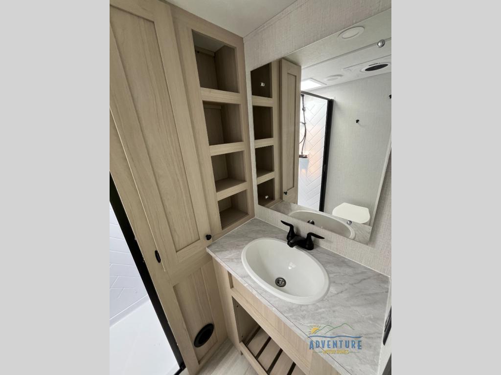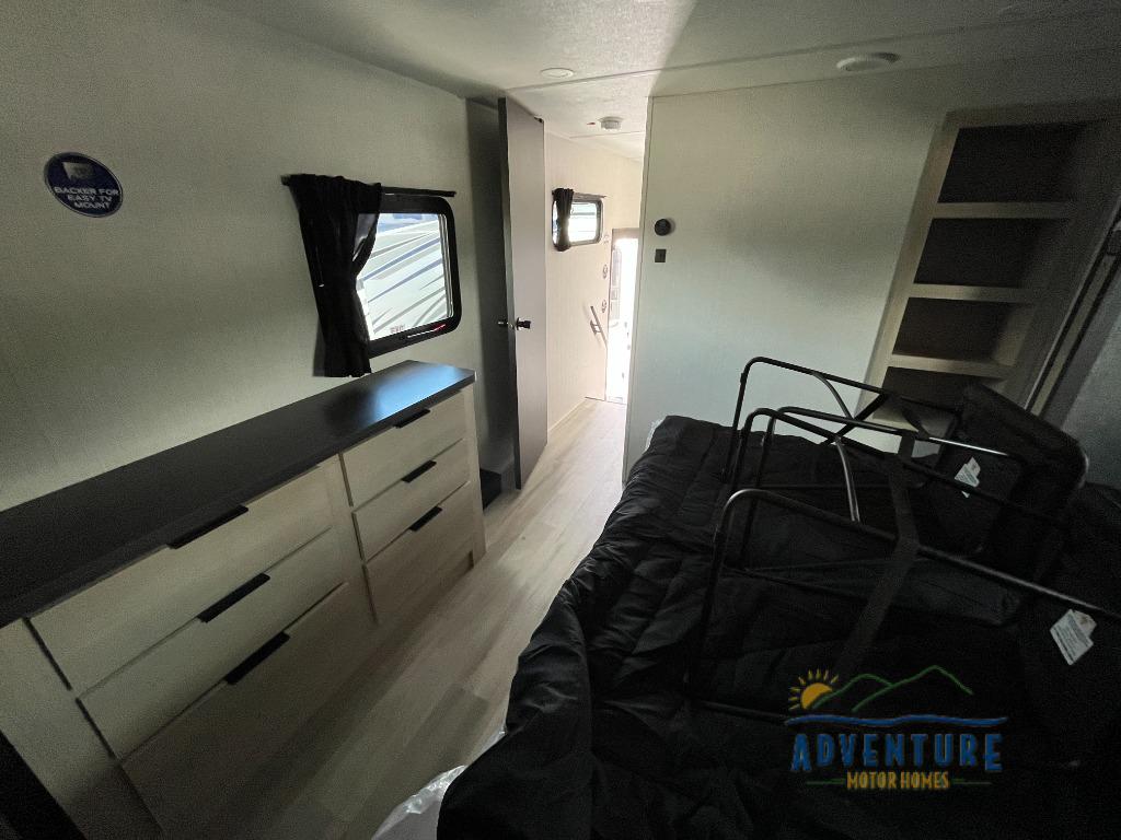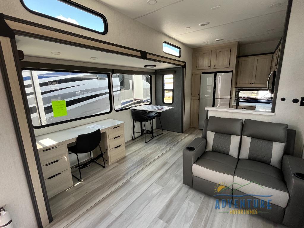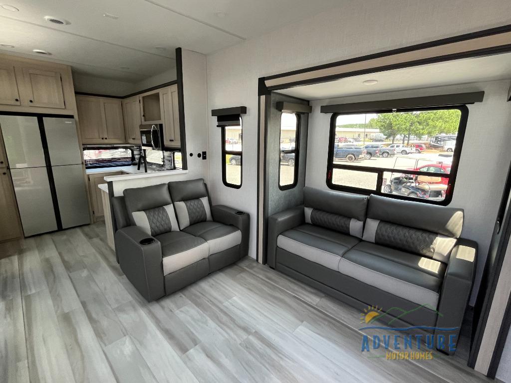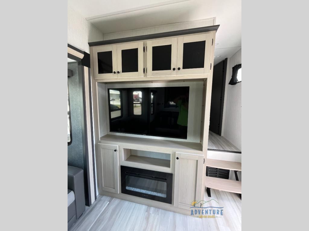 Cook like a chef worthy of a Michelin star in this amazing fifth wheel! Inside, you'll find a spacious rear kitchen, complete with a pantry, a 12V refrigerator ideal for keeping your fruits and vegetables fresh, overhead cabinets, and a sprawling countertop for all your cooking and dining times. The high-top table and chairs provide the perfect place to enjoy meals with family and friends. The living room is a cozy place featuring comfortable theater seating, a tri-fold sofa, a cozy fireplace, an entertainment center, and a convenient desk for staying productive on the go. The full bathroom is also a great place to freshen up, complete with a linen closet and all the amenities you need to take a bath and feel at home. With a spacious shower and plenty of storage, you'll have everything you need to start your day off right. The perfect place to rest and recharge after a long day of adventure is the front bedroom which boasts a comfortable king bed, dresser, walk-in wardrobe with washer and dryer prep, for keeping all your favorite belongings clean and organized on the road. Outside, you'll appreciate the pass-through storage for all your gear and toys, as well as the two awnings (15' and 11') ideal for creating unforgettable memories outside without worrying about the weather.